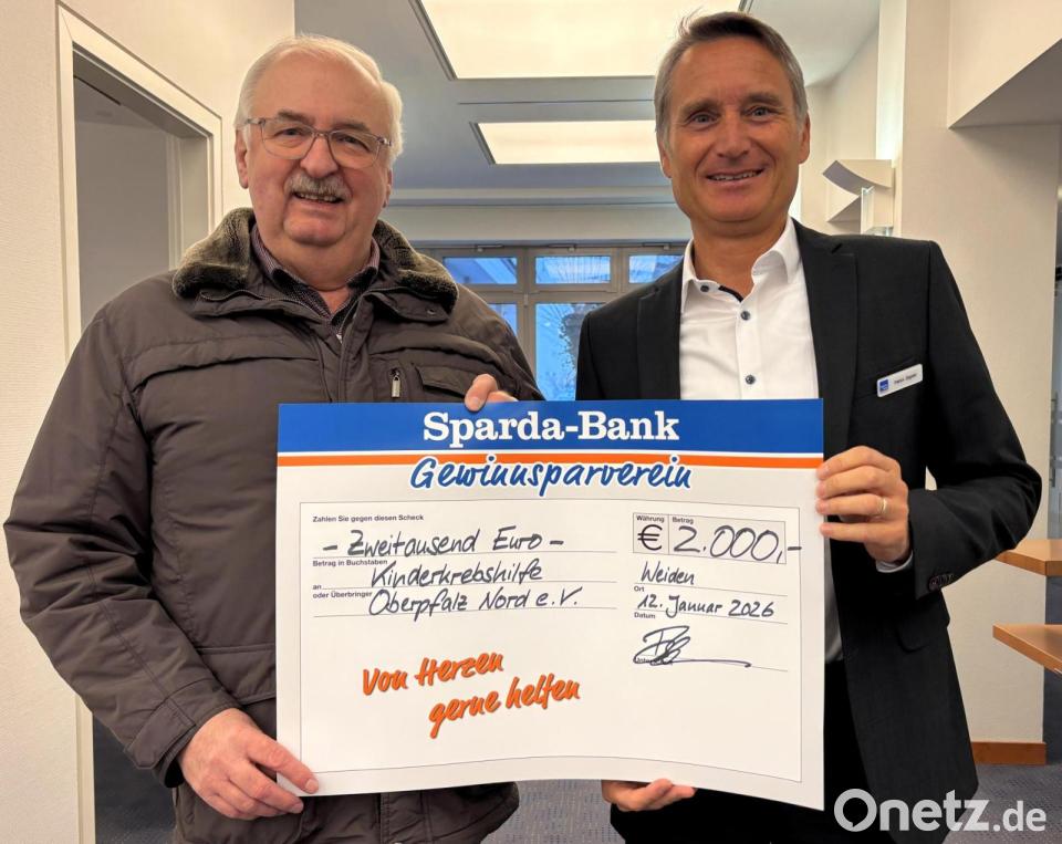 In der Weidener Filiale der Sparda-Bank übergab Filialleiter Patrick Ziegeler am Montag einen Spendenscheck in Höhe von 2.000 Euro an Herbert Putzer, den Vorsitzenden der Kinderkrebshilfe Oberpfalz Nord e.V. Die Spende soll Familien von an Krebs erkrankten Kindern unterstützen, wie die Bank mitteilt.