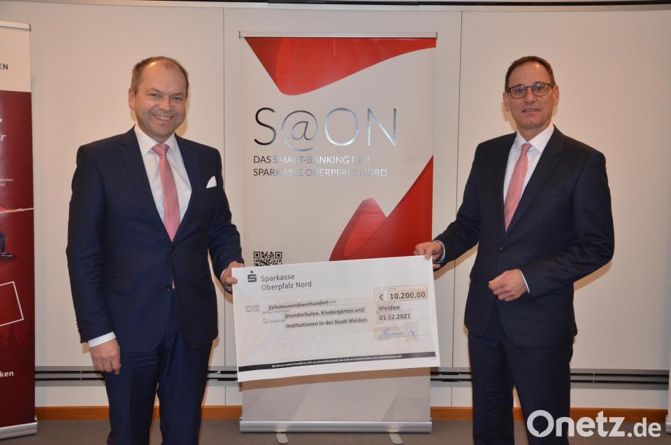 Die Sparkasse Oberpfalz Nord setzt ihre vorweihnachtliche Tradition fort und unterstützt Institutionen aus den Bereichen Erziehung und Bildung mit Spenden. Am Mittwoch überreichten Vorstandsmitglied Hans-Jörg Schön und Filialbereichsleiter Robert Stahl einen symbolischen Scheck in Höhe von 10.200 Euro an Grundschulen, Kindergärten und Horte der Stadt Weiden. Die Beträge würden Mitte Dezember auf deren Konten überwiesen, hieß es.