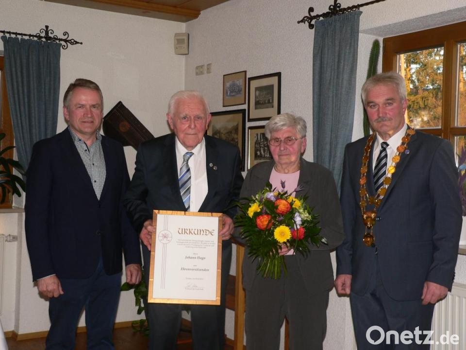 Eine handwerkliche Meisterleistung nannte Schlosser die Anfertigung der Fachschaftstruhe, die handgefertigte Vorstandskette und vor allen Dingen auch die 18 Zunftstangen, die die Handwerkerkirche Sankt Sebastian schmücken und die seine Handschrift tragen. Hagn sei zudem gefragter Ansprechpartner bei Veranstaltungen der Innung wie dem Landesverbandstag in Weiden gewesen. Mit Kollegen habe er die Fachausstellung organisiert und Gastgeschenke gefertigt. Im Oberpfälzer Handwerkerbund ist er bereits Ehrenvorstandsmitglied. Zum Ehrenvorsitzenden wurde Hagn nun in der Fachschaft ernannt. Schlosser überreichte die Urkunde, für Ehefrau Hilde Hagn gab es einen Blumenstrauß. Gerührt sicherte Hagn der Fachschaft auch weiterhin seine volle Unterstützung zu.