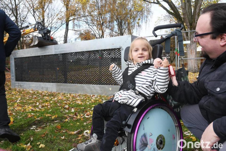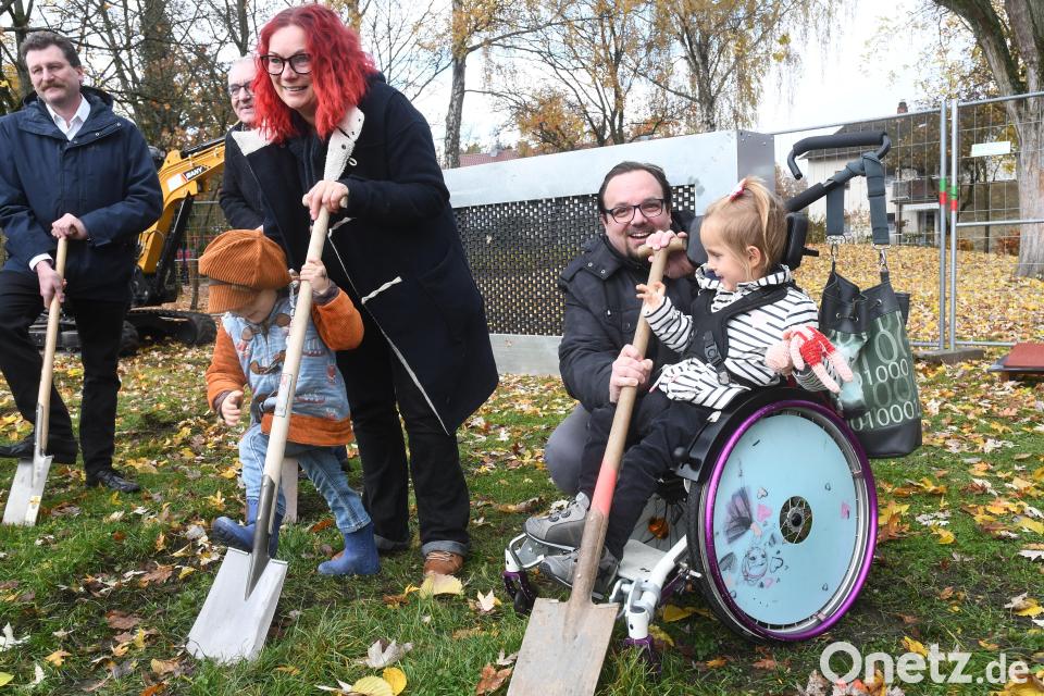 Paulas Mama, Sylvia Lang, freut sich zusammen mit ihrer Tochter über den Bau des Inklusionsspielgeräts am Spielplatz: "Danke." Dabei kommen der Mutter die Tränen: "Es bedeutet mir verdammt viel." Bei einer Bürgerversammlung zum Thema Barrierefreiheit im Sommer regte Sylvia Lang den Bau eines barrierefreien Spielgeräts an. Oberbürgermeister Jens Meyer versprach der Mutter, dass er sich darum kümmere und nahm mit der Familie Kontakt auf. Am Dienstag fand der Spatenstich für das Rollstuhl-Trampolin auf dem Spielplatz am Ulmenweg statt.
