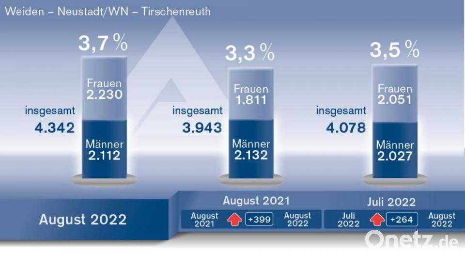 Die Arbeitslosenquote in der Stadt Weiden steigt im Berichtsmonat auf 4,9 Prozent. 1 155 Personen sind arbeitslos, 69 Personen mehr als im Juli und 17 mehr als im Vorjahr. Dieser Anstieg betrifft insbesondere junge Menschen unter 25 Jahre und Frauen. "Auch im Stadtgebiet ist die Sommerflaute mit weniger Personaleinstellungen spürbar", so Wildenauer-Fischer. "Die 1 120 gemeldeten Arbeitsplätze bieten viele berufliche Offerten." Ein Blick auf die Rechtskreise zeigt, dass 428 Arbeitslose im Bereich der Arbeitslosenversicherung gemeldet sind, für 727 Personen ist das Jobcenter Weiden-Neustadt zuständig.
