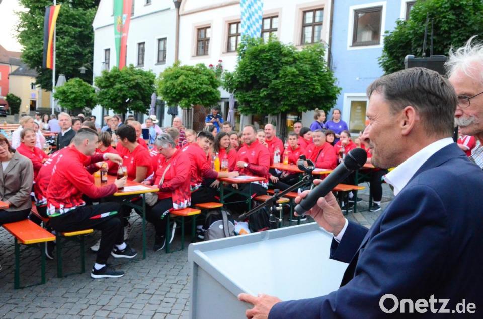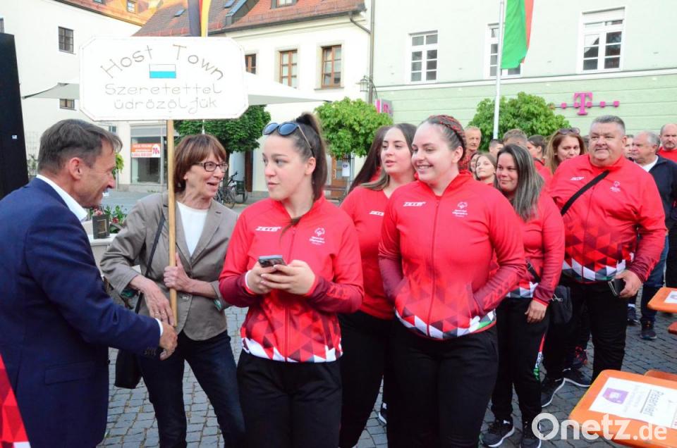 Mit zweieinhalbstündiger Verspätung marschierte die 112-köpfige Special-Olympics-Delegation aus Ungarn am Montagabend vor dem Alten Rathaus ein. Es spielte die "Rüscherl Muse". Die World Games finden ab 17. Juni in Berlin statt. Unter der Schirmherrschaft von Alt-Oberbürgermeister Kurt Seggewiß und der stellvertretenden Landrätin Margit Kirzinger haben die Stadt Weiden und der Landkreis Neustadt die Funktion der Host Town übernommen und dazu ein vielseitiges Programm für die Sportler mit ihren 22 Betreuern auf die Beine gestellt.
