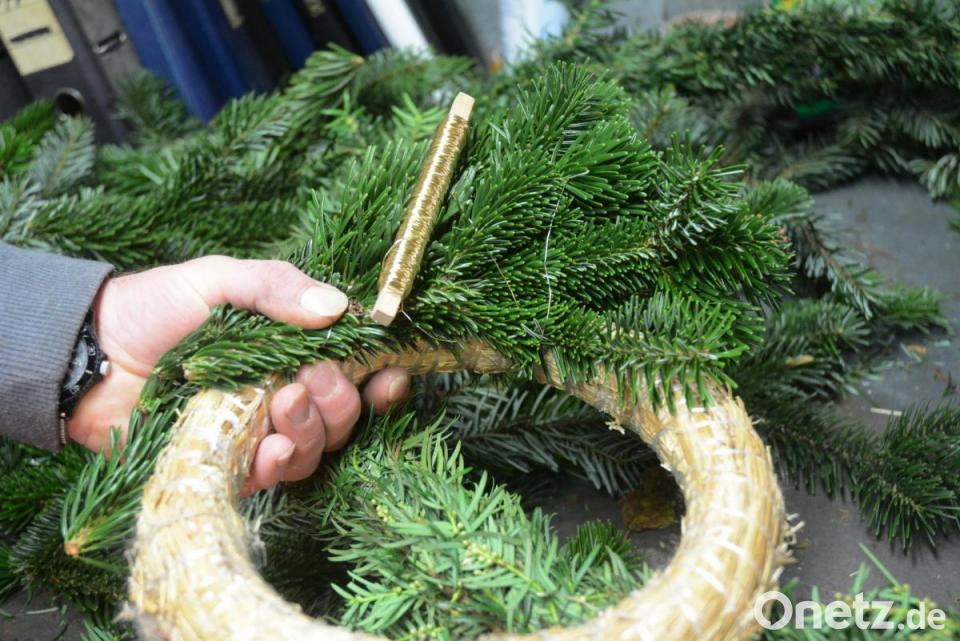 Christine Egeter, Petra Simbeck und Stefan Leymann sind ein eingespieltes Team. Elf Kränze im Durchmesser von 50 bis 120 Zentimetern haben sie gebunden. Es gilt eine lange Liste abzuarbeiten. "Die Kränze oder Gestecke sind für die Schulen und andere städtische Einrichtungen", sagt Egeter. Beim Schmuck dominieren rote Wachskerzen und Schleifen. Auch Extrawünsche werden berücksichtigt. So wollte die Hammerwegschule in diesem Jahr ihren Kranz "pur", damit die Schüler ihn selbst bunt schmücken können. "Manche bringen auch LED-Lämpchen an", weiß die Gärtnermeisterin. Nicht immer werden die Kerzen auch entzündet. "Brandschutz geht natürlich vor", sagt Egeter. Aber in manchen Schulen hat auch der Hausmeister ein Auge drauf. Für die Atmosphäre sei es in jedem Fall schön.
