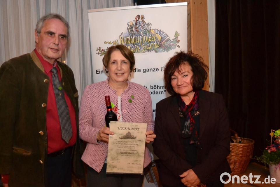 Für 25- jährige Mitgliedschaft zeichneten die „Nordoberpfälzer Musikfreunde“ Marina Völkl und Wolfgang Plödt, bekannt als „Schellenberg-Duo“, aus. Für zehnjährige Treue wurde Landtagsabgeordnete Annette Karl geehrt. Sie gestand, dass sie „kein einziges Instrument“ spiele und „noch dazu eine Zugroaste“ sei, aber trotzdem eine Liebhaberin der nordoberpfälzisch-böhmischen Musik sei. Sie bekam die bronzene Nadel des Vereins. Als fleißigste Musikanten wurden Eugen Eberhardt, Thomas Fritsch, Herbert Storek und Ernie Troidl mit einem kleinen Präsent bedacht. Für besondere Verdienste zeichnete Fuchs Sophie und Rudi Dobmann, Franziska und Peter Ertl, Herbert und Maria Storek, sowie Dagmar Schletz und Anita Holub- Franke aus.