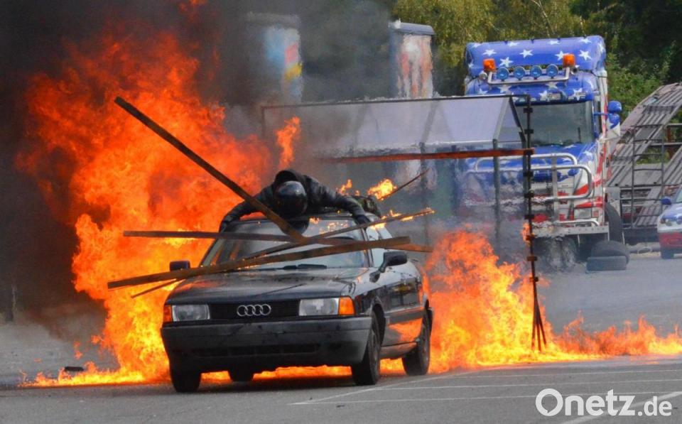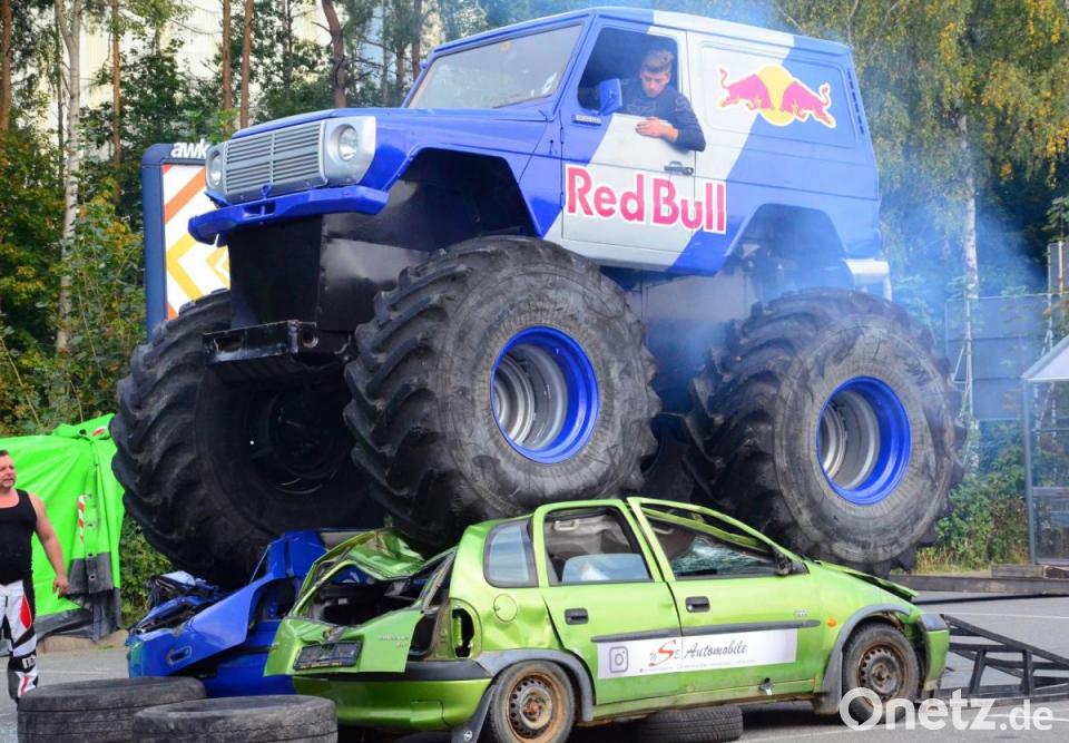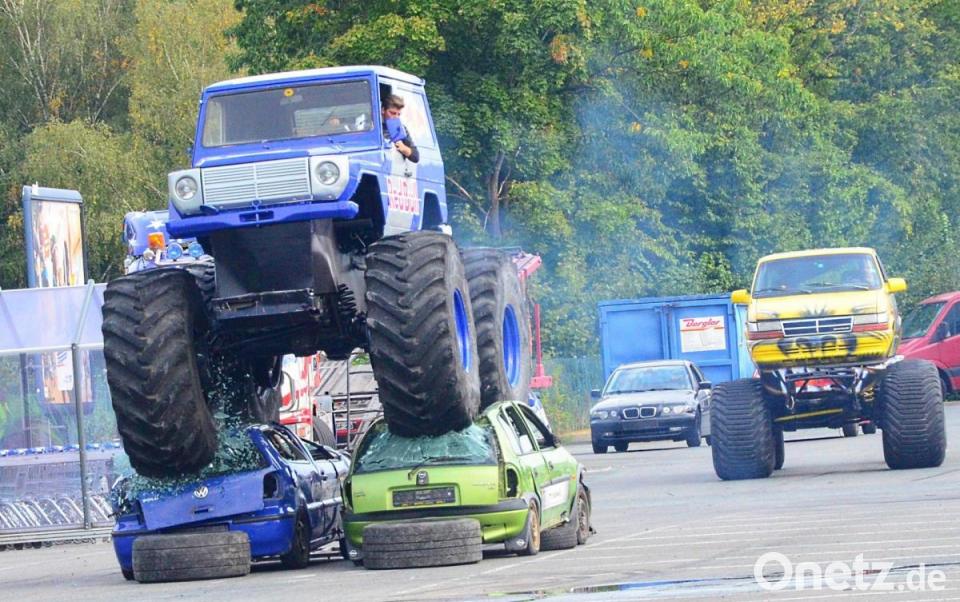 Gib Gummi, bis der Reifen platzt! Die Monster-Truck-Show der Gebrüder Frank auf dem Parkplatz des Realmarktes dürfte am Sonntagnachmittag die Erwartungen der tausend Besucher, darunter viele Kinder, erfüllt haben. Die Zuschauer erlebten Auto- und Motorradstunts. Ein VW-Golf überschlug sich mehrmals. Ein Biker hopste gleich über fünf Autos hinweg, während es ein weiterer Fahrer schaffte, gleich fünf Damen aus dem Publikum gleichzeitig auf zwei Rädern über den Platz zu befördern. Quad-Akrobatik und qualmende Reifen. Ein Fahrzeug durchbrach mit einem Stuntman auf dem Dach eine Feuerwand und am Schluss bejubelten alle das Zerquetschen zweier ausgedienter Pkws durch zwei bis zu 1400-PS-starke Riesentrucks.