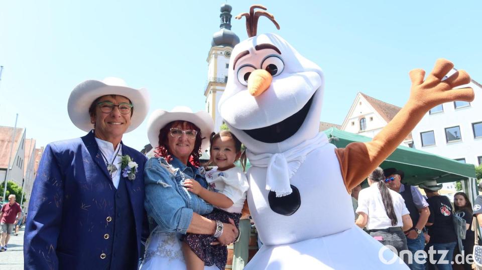 Vor zwei Jahren hatten sich die "Swinging Hats" der Weidener SpVgg SV Weiden angeschlossen. Die Vereinsmitglieder bildeten vor der Treppe des Alten Rathauses ein Spalier aus weißen und roten Luftballons und begrüßten das frischvermählte Ehepaar mit ihren Cowboyhüten. Unter den Gratulanten war auch Simone Sanders Enkeltochter Rori. Ein weiterer Gratulant war "Olaf", der lustige Schneemann aus dem Disneyfilm "Die Eiskönigin". Claudia Messers Lieblingsfigur aus dem Film.