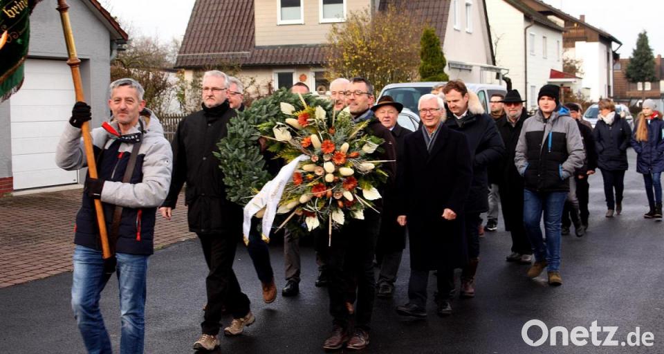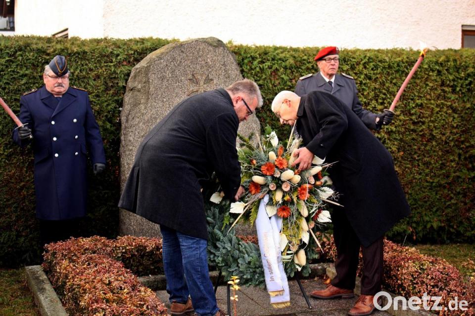 Gemeinsam legten Reinhard Meier und Hans-Jürgen Meier den Kranz am Mahnmal nieder. Die Reservistenkameradschaft hielt die Ehrenwache. Trompeter Karl Völkl spielte das Lied „Ich hatt' einen Kameraden.“ Die Reservistenkameradschaft hielt mit brennenden Fackeln eine Ehrenwache.