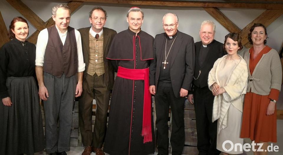Bischöflicher Besuch bei der "Resl": Rudolf Voderholzer sah sich am Samstag privat das Theaterstück "Resl unser" in der Regionalbibliothek Weiden an - und war "sehr beeindruckt". Der Regensburger Bischof (Fünfter von links) lobte an der Inszenierung des Landestheaters Oberpfalz (LTO), dass "alle Für und Wider rund um die Mystikerin aus Konnersreuth vorkommen". Auch die Rolle seines damaligen Vorgängers Henle (gespielt von Stefan Puhane, Vierter von links) gefiel ihm. "Besonders wichtig ist, dass die Ereignisse rund um Therese Neumann kontextualisiert in die Zeitgeschichte des Nationalsozialismus eingebettet dargestellt werden", betonte Voderholzer, der sich mit dem Phänomen der Konnersreuther Resl bereits in seiner Studienzeit befasst hatte. Auch, dass es in dem Stück keine Tabus gebe und fromme Positionen ebenso Eingang gefunden hätten wie skeptische Haltungen. "Hier kommen wirklich alle Seiten vor", meinte der Bischof, der sichtlich auch den heiteren Seiten des Stücks etwas abgewinnen konnte. Zumal Autor Bernhard Setzwein auf billige Gags auf Kosten religiöser Gefühle verzichtet habe. "Vielmehr wartet er mit tiefer Sachkenntnis auf und bringt unerwartete Wendungen", sagte Voderholzer.