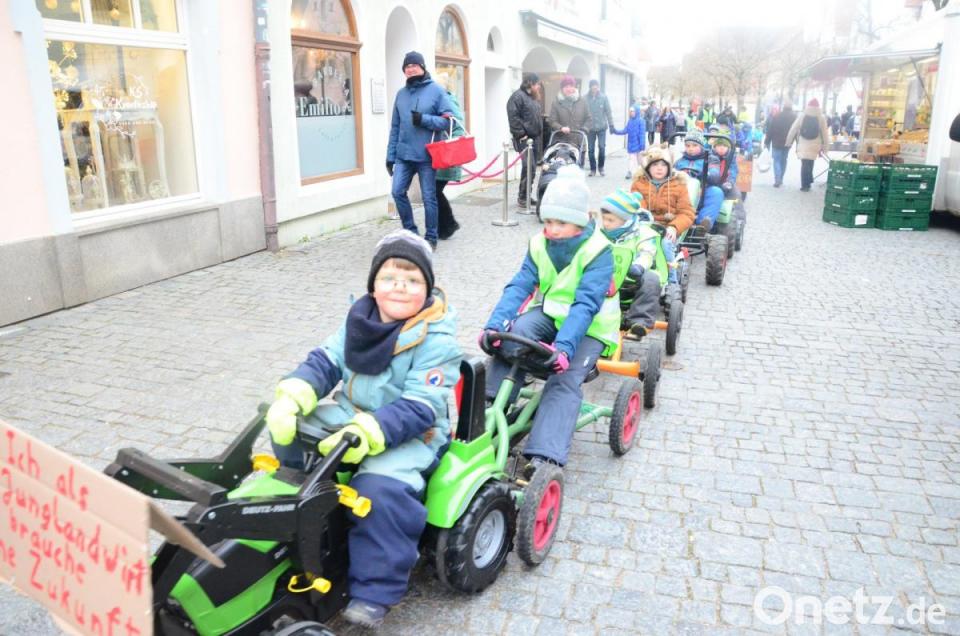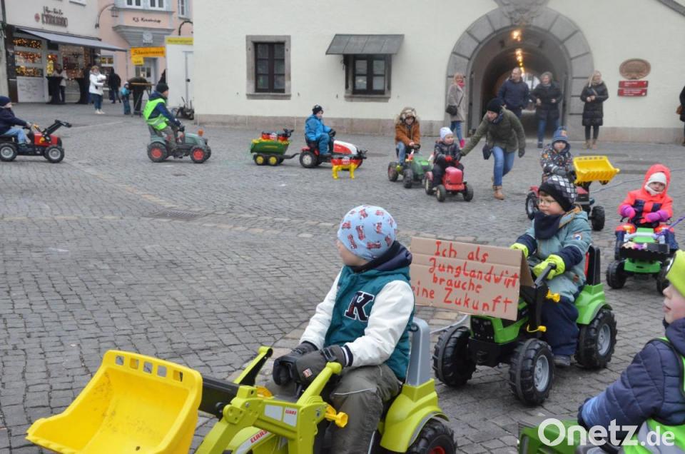"Wir Bauernkinder brauchen eine Zukunft", stand auf dem Schild, das an der Gabel des grünen Mini-Laders festgemacht war. "Kinder an die Macht" auf einem weiteren. Rund 150 Kinder waren an der Tretbulldog-Demo zwischen Oberen und Unterem Markt am Samstag in Weiden beteiligt.