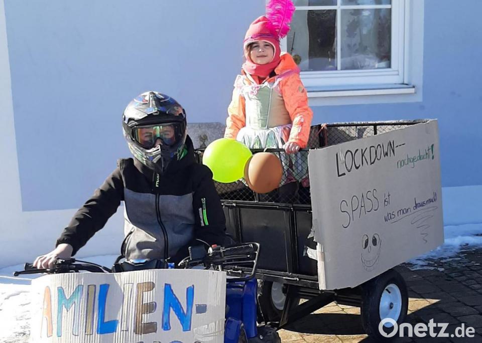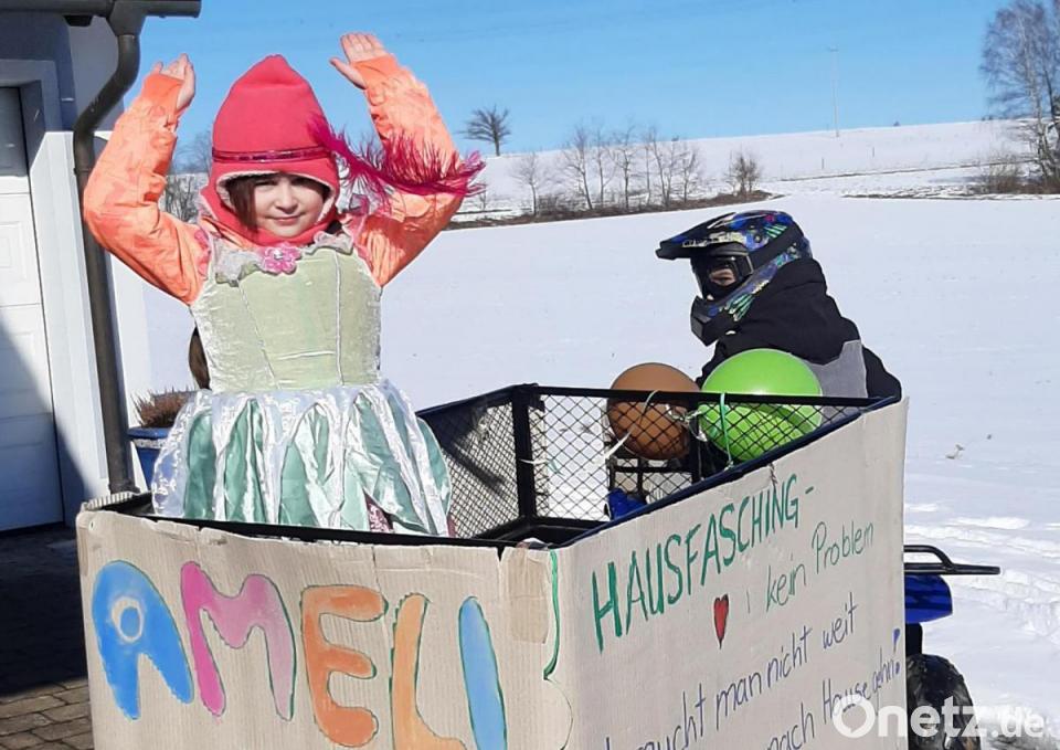 Ein bisschen Faschingszug geht immer: Paul und Ameli starten in der Hofeinfahrt der Familie Reinl in Vohenstrauß durch.