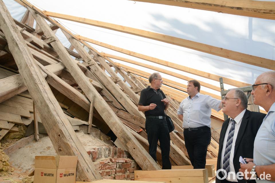 (wd) Über die Entwarnung informierten Kirchenpfleger Karl Süß und Architekt Walter Bauer beim Ortstermin im frei gelegten Gebälk Bezirkstagsvizepräsidenten Lothar Höher und Bezirksheimatpfleger Dr. Tobias Appl. Auch ohne das befürchtete Groschengrab, das sich bei der Kirchturmsanierung aufgetan hätte, berichtete Süß von einer Kostenmehrung von 630 000 auf inzwischen 700 000 Euro. Der Pilzbefall ist durch die über Jahrzehnte eingedrungene Feuchtigkeit größer als angenommen. Morsche Balkenfüße müssen gekappt und durch maßgenau gehobelte Balken ersetzt werden. 6 bis 7 Kubikmeter Holz sind inzwischen eingepasst.
