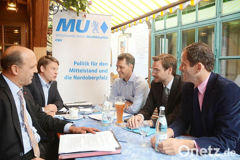 Das machten die Vorsitzenden der Mittelstands-Union (MU) Nordoberpfalz, Harald Gollwitzer, des MU-Kreisverbands Tirschenreuth, Leonhard Zintl, und des MU-Bezirksverbands, Benjamin Zeitler, beim Sommergespräch mit CSU-Bundestagsabgeordnetem Albert Rupprecht deutlich. Mit dabei in der Runde beim "Bräuwirt" war am Freitag der Stimmkreiskandidat Stephan Oetzinger.