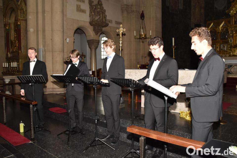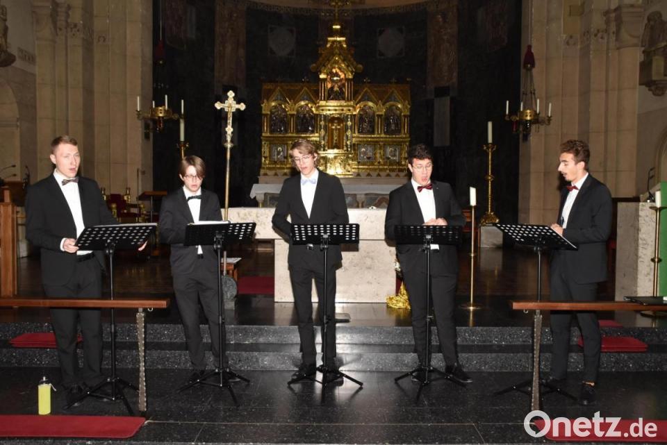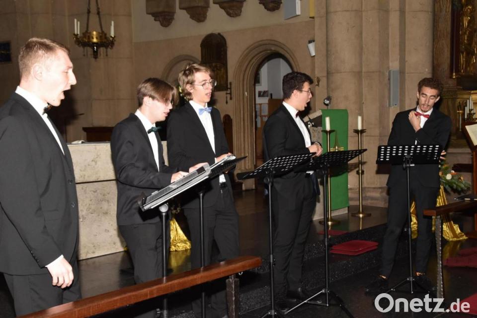 Peter Ermer, der mit seiner Konzertgitarre schon die Mittagsandacht Ende August gestaltet hatte, trat am Samstag noch einmal bei "Punkt 12" in der Josefskirche auf: diesmal zusammen mit Julius Weleba (Schirling), Nicolas Weigl (Obertraubling), Constantin Brandscherdt (Köfering) und Leonhardt Pernpeintner (Markt Schönberg/Grafenau). Die beiden Tenöre, zwei Bariton- und der Bass-Sänger wirkten alle bis zum Abitur bei den Regensburger Domspatzen. Und sie haben es sich weiterhin zur Aufgabe gemacht, als Vokalensemble „Quintessenz“ die Tradition der A-cappella-Musik zu pflegen.