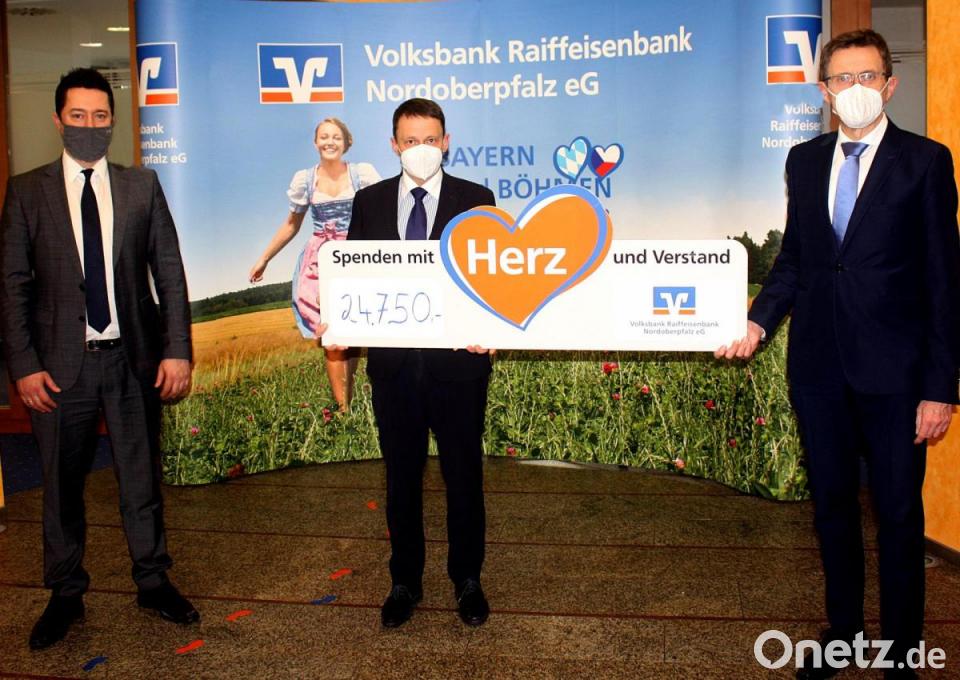 Einen großen Scheck durfte Oberbürgermeister Jens Meyer zusammen mit den Regionalleitern der Volksbank Raiffeisenbank Christian Weigert und Michael Hösl halten. Das Geld ist inzwischen aufgeteilt und liegt schon auf den Konten der Vereine, Verbände und Institutionen. „Der Scheck ist somit nur symbolisch, ich danke stellvertretend für alle Empfänger, die dankbar die Spenden annahmen“, sagte Meyer.