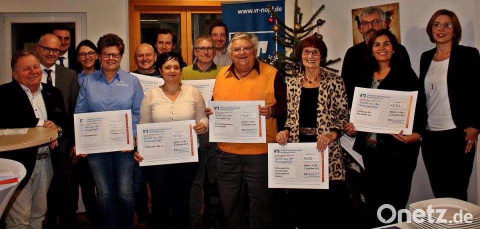 Aus dem Gewinnspartopf der Volksbank Raiffeisenbank überreichten beide jeweils zehnmal 500 Euro an Vereine und Verbände. Je 500 Euro erhielten die Katholische Kirchenstiftung St. Emmeram, Windischeschenbach, der Männergesangsverein Pleystein, der VfB Mantel, TV Bechtsrieth, SpVgg Schirmitz, Deutscher Alpenverein Sektion Weiden, Hoffnung für Menschen Weiden, Kapellenverein Groppenheim in Waldsassen, ATS Mitterteich 1910 und der Förderverein für Schwerkranke in Weiden.
