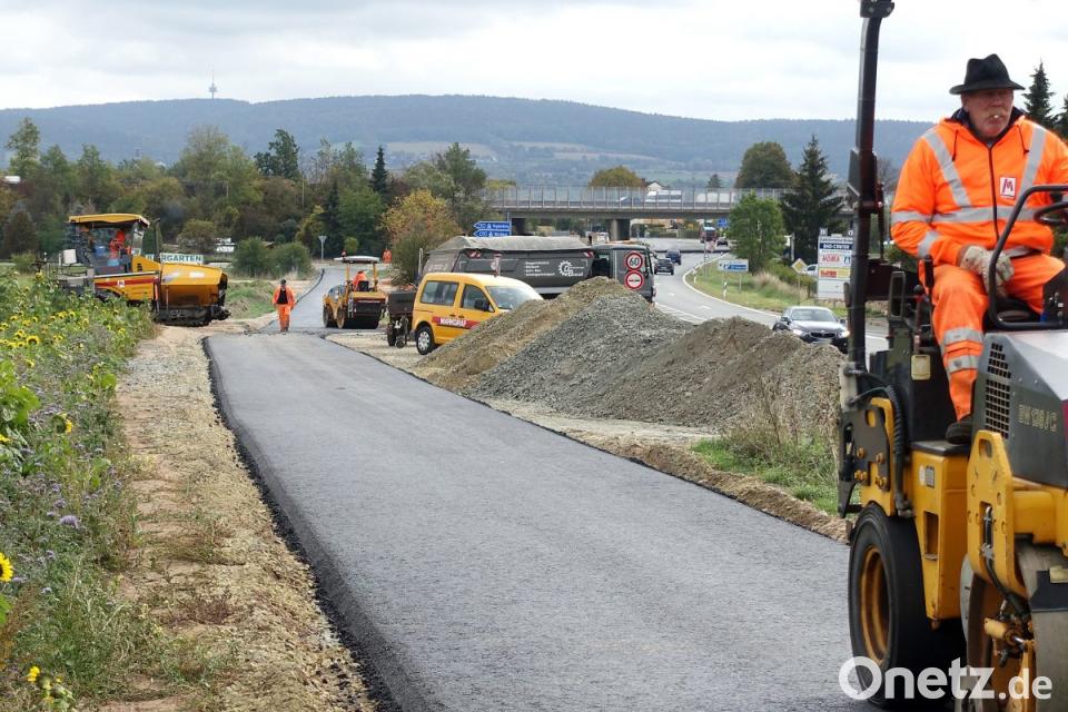 Bis in vier Meter mussten seit Herbst 2017 die Rohre auf der 3,5 Kilometer langen Trasse (mit aufwendiger „Unterführung“ der Bahn und der Staatsstraße) verlegt werden. Die Gräben sind inzwischen verdichtet, geschlossen und der Unterbau für den Weg eingebaut. Am Dienstag begann die Firma Markgraf mit der Asphaltierung. Am Donnerstag wird die bituminöse Feinschicht aufgebracht.