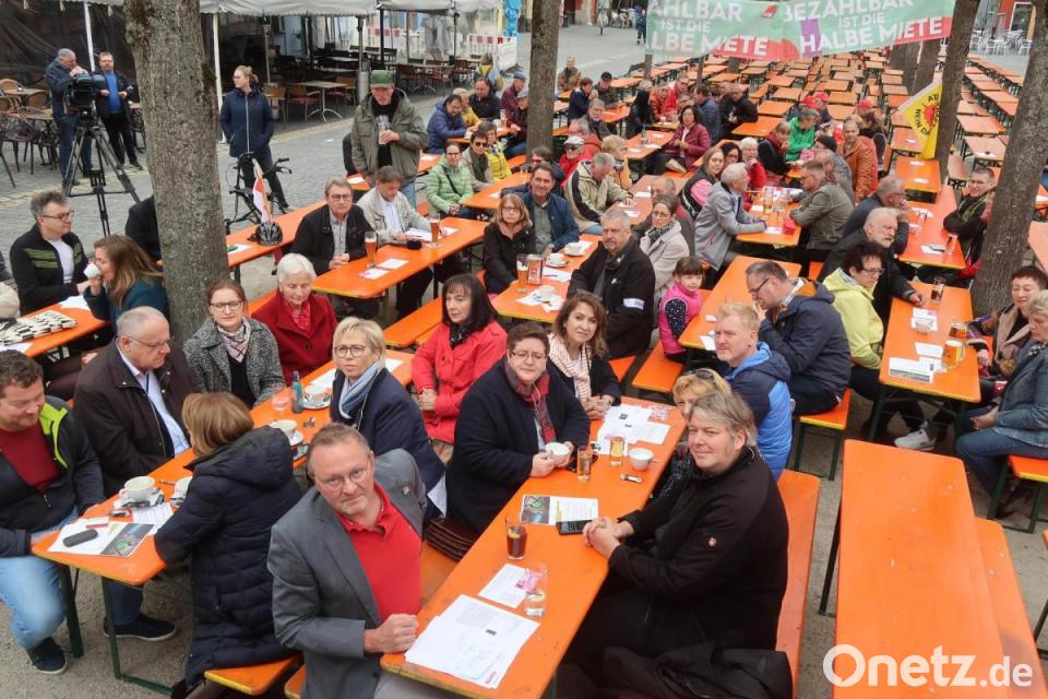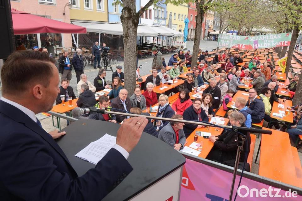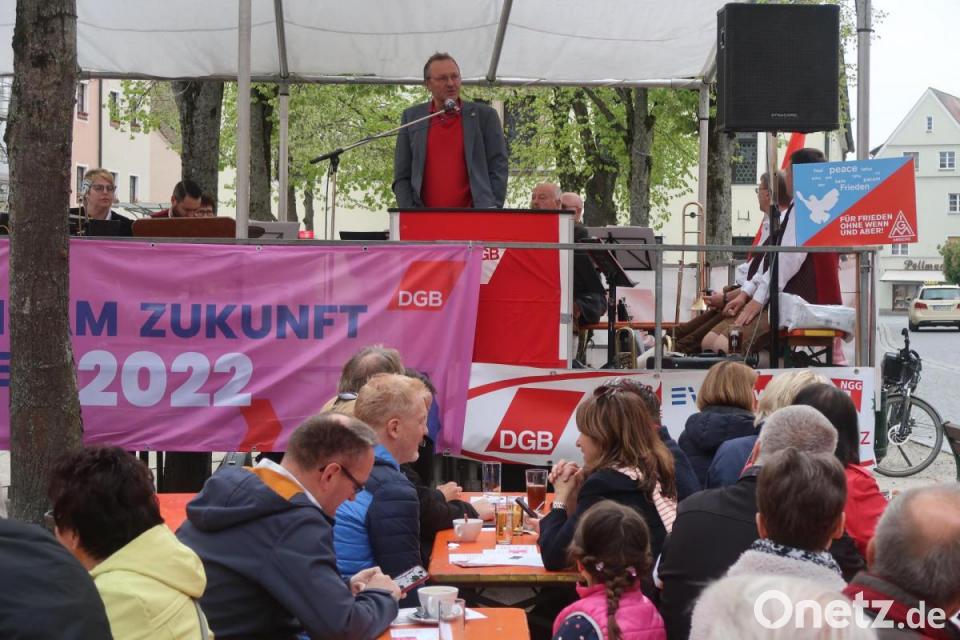 Oben auf der Freiluftbühne spielte die Stadtkapelle. Unten an den Biertischen saß die Politprominenz von Kommunen, Land und Bund. "Bezahlbar ist die halbe Miete", "Für Frieden ohne Wenn und Aber": Die rund um den Platz aufgehängten Transparente machten deutlich, woher der Wind am Sonntag wehte. Und Oberbürgermeister Jens Meyer hatte bei der Maikundgebung, zu der DGB und IG Metall Amberg aufgerufen hatten, hinterm Alten Rathaus eine Menge zu erzählen. „Vor zwei Jahren wäre das meine erste Veranstaltung als Oberbürgermeister gewesen", begann er seine Rede. Stattdessen hatte er dank Corona einen sehr ruhigen ersten Arbeitstag. Wie die Erfahrung leider zeigte, mit einer entbehrungsreichen Zeit im Schlepptau. "Da hat sich verdeutlicht, wie wichtig Arbeit für die Menschen ist."