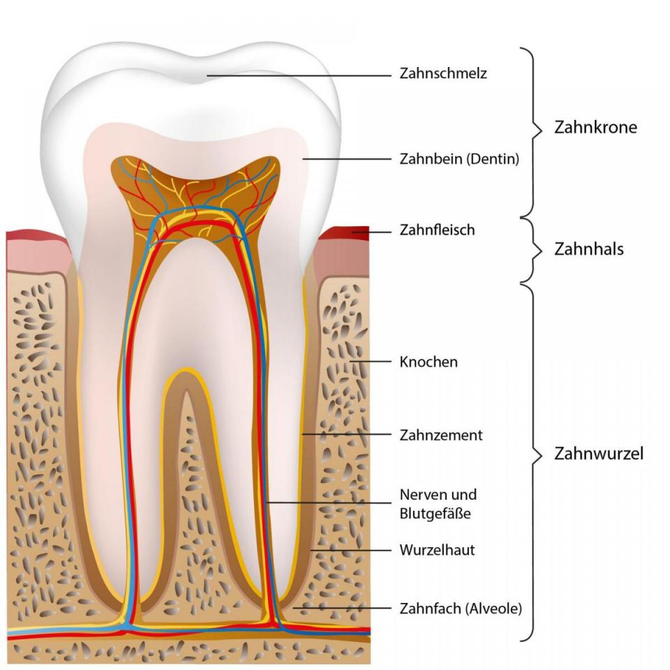 Der Zahnschmelz (Adamantin) ist die äußerste Schicht des Zahns. Er umschließt im oberen Bereich der Krone das Zahnbein (Dentin). Der Zahnschmelz enthält Kalzium, Phosphor, Magnesium und Natrium, einige Proteine und Fette. Zu 95 Prozent ist er anorganisch und besteht weitgehend aus dem Phosphat Hydroxylapatit. Diese Substanz ist säurelöslich. „Zahnschmelz löst sich auf bei einem pH-Wert von 5,5“, erklärt Dr. Ullrich.