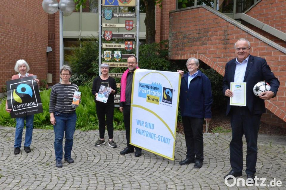 Die Kampagnenleitung Fairtrade Towns der Trainsfair in Köln würdigte mit der Urkunde das unermüdliche Engagement für ehrlichen Handel der Stadt Weiden. Mit Höher und Wirtschaftsförderin Cornelia Völkl freuten sich die Mitglieder der Lenkungsgruppe Annette Rösl vom Weltladen, Michael Träger und Christa Burzer von der KAB und Veit Wagner von der Agenda 21.