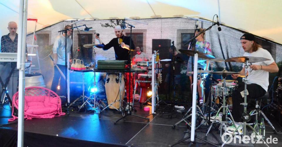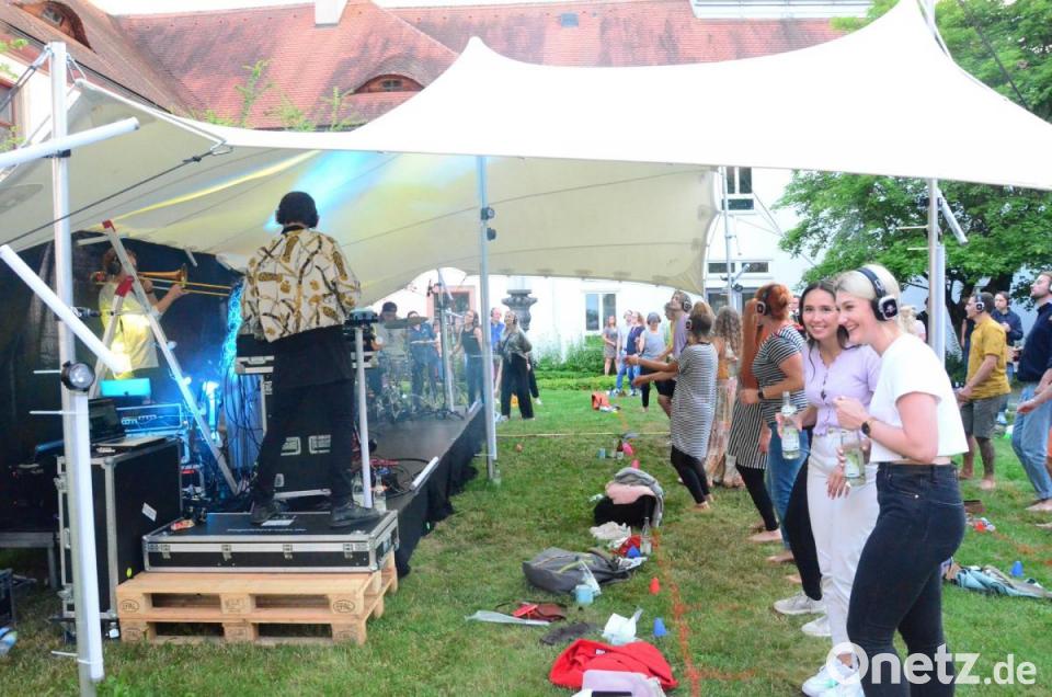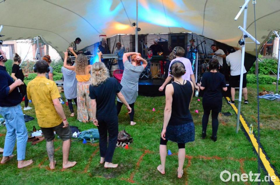 „Slatec“ sind altbekannte „Sünder“. Bereits 2019 und 2020 spielte die Techno-Formation um Roman Sladek beim „Sündikat“. Am Samstag war die Combo wieder da. Im Gegensatz zu „Elektro Guzzi“, die vor zwei Wochen den Innenhof der Regionalbibliothek mit ihren aufgefrischten, aber festen Songstrukturen aufmischten, setzten „Slatec“ auf die freie Improvisation. Niemand, nicht mal die Musiker selbst, wussten, in welche Richtung sich die Ideen weiterentwickelten. Die Besucher hatten Kopfhörer auf, um auch allerfeinste Nuancen zu hören. Innerhalb aufgesprayter Rasenflächen oder Hula-Hoop-Reifen durften sie sich auch rhythmisch im Takt der energiegeladenen Musik bewegen.