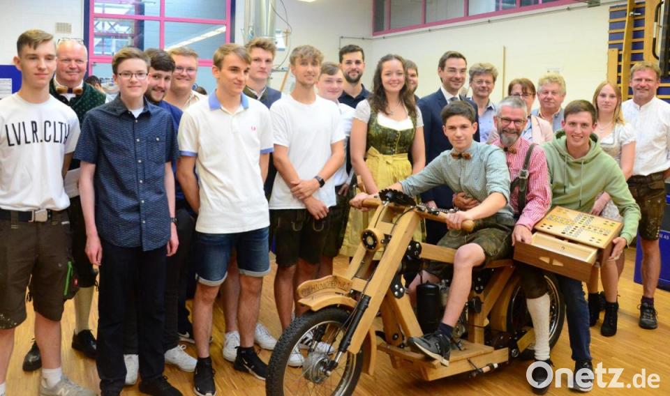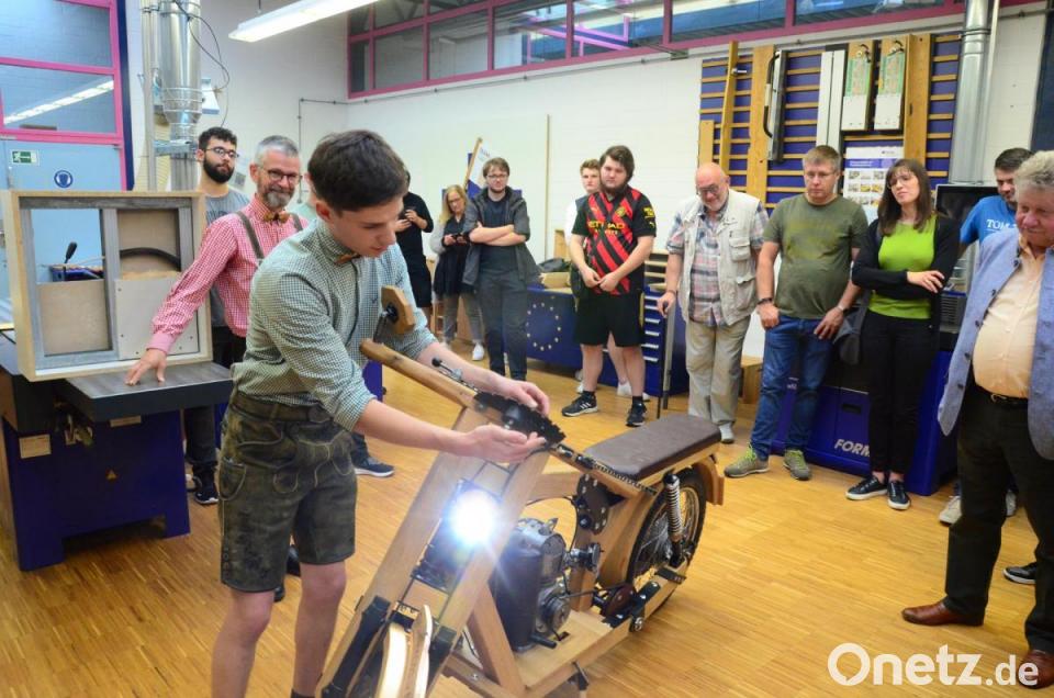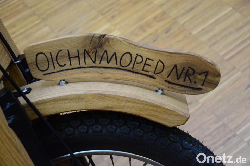 Das "Oichnmoped Nr. 1" ist aus Eichenholz, hat 4,5 PS und ist voll fahrtüchtig. Die Maschine des Liebensteiners Peter Gmeiner war der Hingucker bei der Schreinerausstellung in der Europa-Berufsschule. Sogar die Fliege am Hemdkragen ist aus Holz gefertigt. Peter Gmeiner nennt seine Maschine liebevoll "Oichnmoped Nr. 1". Warum? Weil das Zweirad aus Eichenholz konstruiert ist. Solange es noch Tüftler gibt wie ihn, muss dem Land um seinen Handwerkernachwuchs nicht bange sein. Das Moped ist nicht sein Gesellenstück. Dafür hätte die vorgegebene Zeit nicht gereicht, schmunzelt der Konstrukteur. Für seine Abschlussarbeit hat sich Gmeiner ein anderes Werkstück ausgedacht. Aber die Maschine des Liebensteiners war der Hingucker bei der Schreinerausstellung in der Europa-Berufsschule.