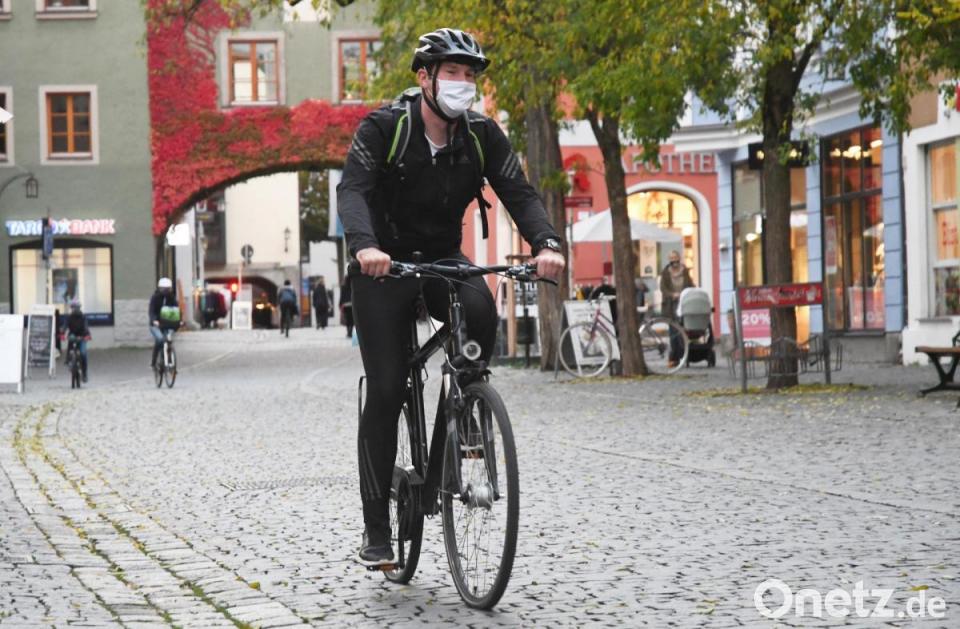 Tatsächlich müssen radelnde Bürger einen Mund-Nase-Schutz tragen, denn: Fahrradfahrer benötigen während der Fahrt in der gesamten Fußgängerzone (Verkehrszeichen "Fußgängerzone") eine Maske, schreibt die Stadt Weiden auf ihrer Internetseite. Damit sei sichergestellt, dass auch bei verkehrsbedingtem Halten oder einem kurzen Halt zum Plausch mit Bekannten jederzeit ein ausreichender Sicherheitsstandard eingehalten wird. Die Maskenpflicht gelte von 9 bis 19 Uhr an Werktagen.
