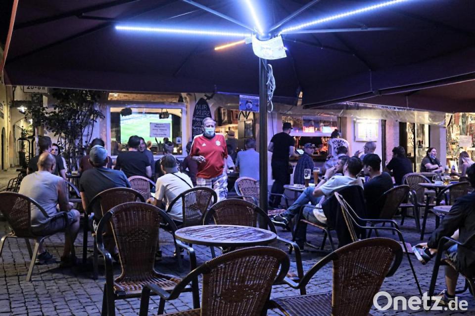 „Tooor!“ schallte es Mittwochabend aus einem Lokal in der Fußgängerzone. 18. Minute: Serge Gnabry hatte soeben den Ball im französischen Netz versenkt. Der FC Bayern führte 1:0 gegen Olympique Lyon. Es sollten noch zwei weitere Treffer folgen. Das Champions-League-Halbfinale wurde nicht im Free-TV gezeigt. Umso mehr begehrt waren Plätze in Lokalen mit Abonnement. Auch Frank Höllriegl ("Kir Royal") konnte damit dienen. 15 beziehungsweise 12 Bayern-Fans feierten den Sieg vor zwei Großleinwänden in zwei Räumen. Wer draußen saß, schaute durchs Fenster zu. Denn Monitore unter freiem Himmel machten sich rar.