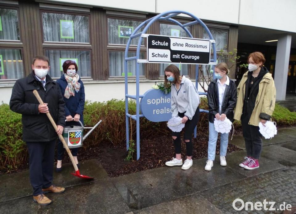 Oberbürgermeister Jens Meyer dankte der Schule mit Projektleiter und Konrektor Georg Hammer für die Ausstellung. Die Schülersprecherinnen hängten weiße Rosen an einen Baum vor der Schule. Die Schulfamilie pflanzte zusammen mit Meyer eine weiße Rose.