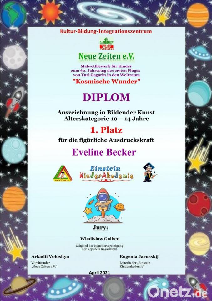 Unter dem Titel "Der wunderbare Weltraum" malten die Kinder farbenfroh und phantasievoll Raketen, Raumfahrer und Planeten, Sterne und Weltraumspaziergänge. Der Vorsitzende des Vereins Neue Zeiten, Arkadii Voloshyn, begutachtete die Ergebnisse. Der insgesamt dreiköpfigen Jury gehörten außerdem die Leiterin der Kinderakademie Eugenia Jaruskij und Wladislaw Galben, Mitglied der Künstlervereinigung der Republik Kasachstan, an. Auszeichnungen vergaben sie in verschiedenen Kategorien und Altersklassen. So bedachten sie beispielsweise Eveline Becker mit einem 1. Platz für die figürliche Ausdruckskraft unter den 10 bis 14-Jährigen.