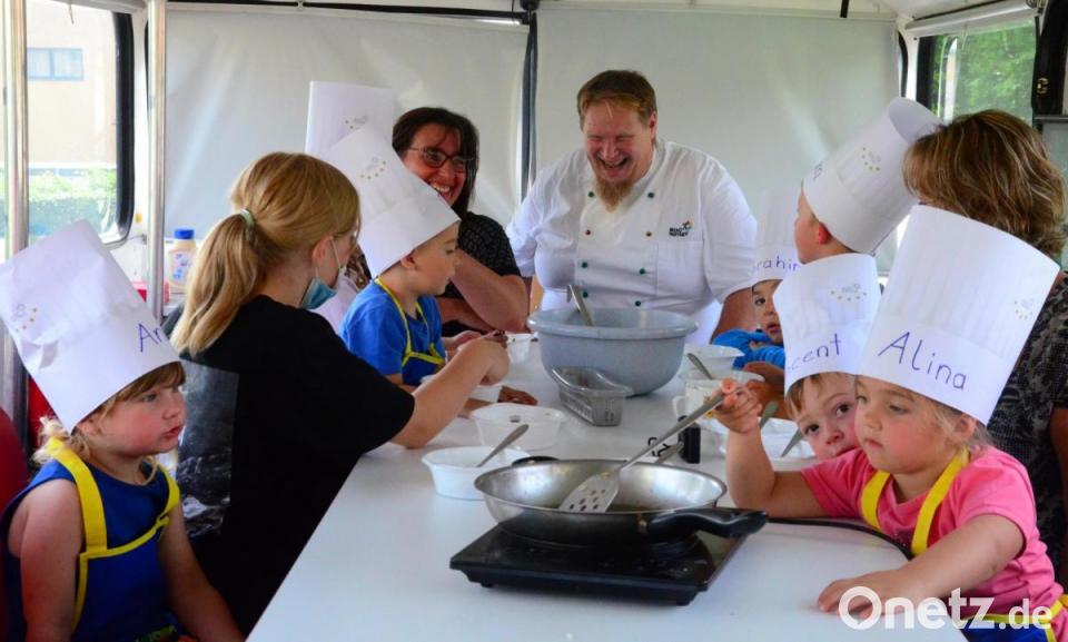 Die Kinder werden die Kelly-Family nicht mehr kennen. Aber genauso muss es damals in der Großfamilie zugegangen sein, als Paddy, Maite, John, Angelo und Patricia in ihrem Doppeldecker unterwegs waren und miteinander kochten. Der Kochbus, der am Dienstagvormittag vor ihrer Kita am Hammerweg parkte, erregte jedenfalls Aufsehen. Vor allem im Inneren, wo die Kindergartenkinder von St. Markus gemeinsam mit Chefkoch Martin Schneider auf Kochtopf-Abenteuer gingen.