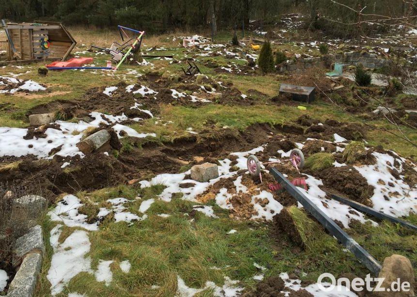 Tatsächlich sah der Garten des inzwischen leer stehenden Hauses kurz nach dem Jahreswechsel 2015/2016 aus wie "nach dem Krieg". Der Boden war umgeackert. Das Spielhaus der drei gemeinsamen Kinder war umgestürzt, die Schaukel lag wie ein Riesenmikado in der (ehemaligen) Wiese. Die damals getrennt lebende Ehefrau verdächtigte den Ehemann und zeigte die Sachbeschädigung an. Bei der Polizei ging das "Duo Infernale" damals schon ein und aus: Es war die sechste wechselseitige Strafanzeige der Eheleute (nach Beleidigung, Körperverletzung und Diebstahl). Wer letztlich die Baggeraktion zu verantworten hatte, wurde nie geklärt. Das Verfahren wurde eingestellt.