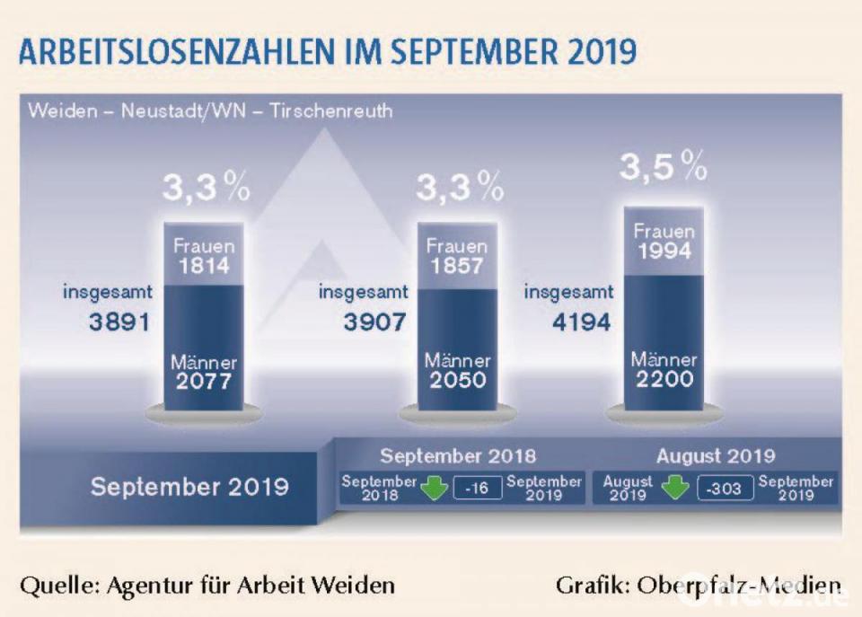 „Erwartungsgemäß ist die Arbeitslosigkeit im September wieder gesunken, genau gesagt um 0,2 Prozentpunkte auf 3,3 Prozent. Insgesamt 2077 Männer und 1814 Frauen sind im Agenturbezirk von Arbeitslosigkeit betroffen. Ursächlich ist die hohe Einstellungsbereitschaft der regionalen Betriebe. So wurden nach Ende der Urlaubs- und Ferienzeit viele Arbeitsverhältnisse geschlossen, insbesondere junge erwerbslose Menschen nehmen ihre Chance wahr und starten in eine neue Beschäftigung oder in eine Ausbildung“, erläutert Thomas Würdinger, Vorsitzender der Geschäftsführung der Agentur für Arbeit Weiden.