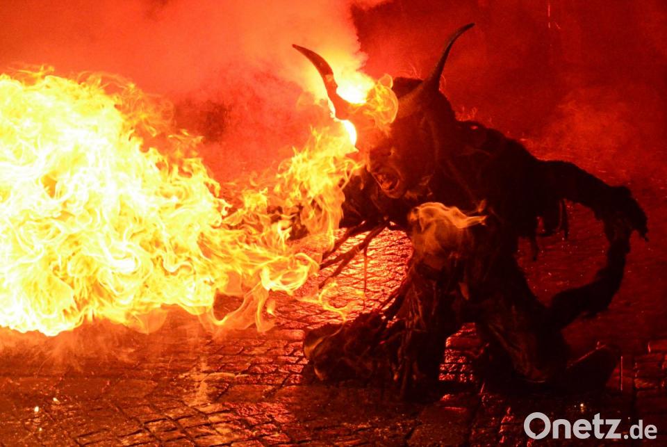 Der Platz war aus Sicherheitsgründen weiträumig abgesperrt. Nur auf diese Weise konnten „Rauhwuggerl“, „Hobangoaß“ und die anderen Dämonen ihre Feuershow so richtig ausleben. Kurz erklärt: Es ging um einen Wanderer, der in einer der zwölf Raunächte von Geistern verfolgt wird, die schlussendlich von einem Priester entzaubert und vertrieben werden.