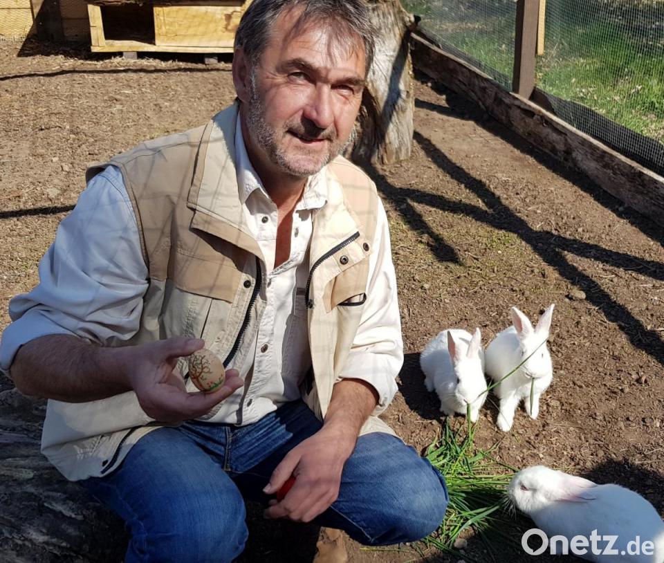 Die Verbundenheit zur Natur, die Manfred Urban im Tierpark auslebt, zeigt sich auch in seinem Ei mit Baum, Wiese und Blumen. Das finden sogar seine weißen Osterhasen gut, die sofort angehoppelt kommen, wenn er das Gehege betritt und ihnen etwas Gras anbietet. Gelegt hat das Ei eines der Seidenhühner, die man neben Schafen, Ziegen, Pfauen, Kängurus, Emus und vielen weiteren Tieren im Gleitsbachtal erleben kann. „Eier haben wir immer mehr als genug. Damit versorgen wir die ganze Familie“, sagt Urban.