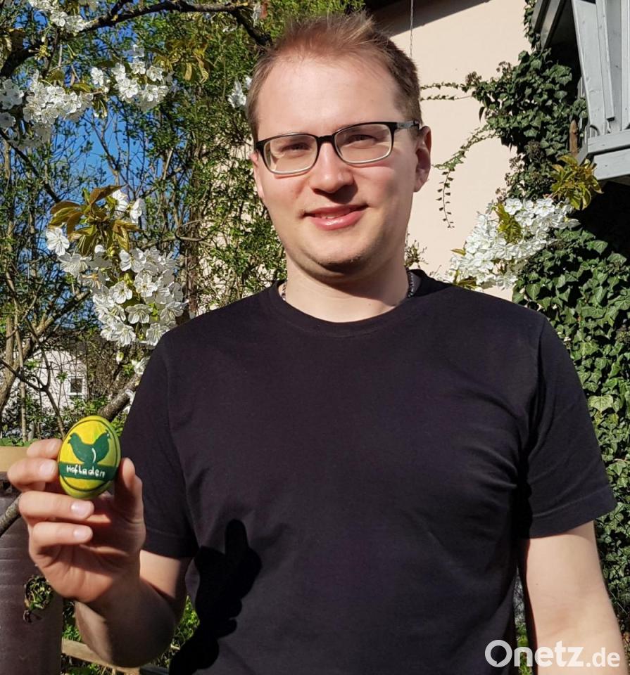 Frisch aus dem mobilen Hühnerstall von Jakob Walberer stammt sein mit einem Huhn bemaltes Ei. Der Schwarzenbacher Landwirt erklärt: Er selbst hat es nicht mit grüner und gelber Acrylfarbe bemalt, sondern seine Schwester Eva (26). Er sei da weniger begabt. Die 350 Hühner, die Walberer in einem mobilem Stall und auf einer Wiese am Ortseingang hält, liefern pro Tag rund 300 Eier.
