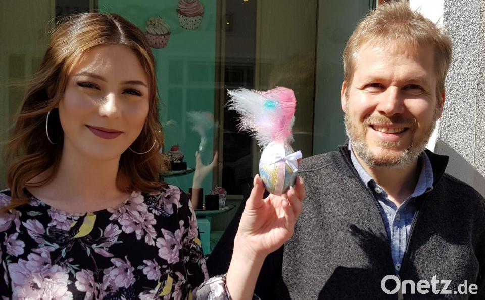 Zwei Stunden hat es gedauert, bis Claudia Janotta das Gänseei mit blauer und rosa Farbe, Dekoband, Federn und Glitzer verziert hatte. Zu recht stolz präsentiert die Mitarbeiterin der Goldschmiede Gruhle in Weiden das Ei zusammen mit Stefan Gruhle. „Die Farben muss man in einen Behälter tröpfeln, etwas vermischen und dann für den Marmor-Effekt das Ei reinhalten“, erklärt sie. Für die Farbkombination hat sie sich von den Goldschmiede-Schaufenstern inspirieren lassen.