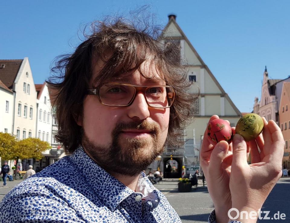 Tobias Sonna, Inhaber von „Sonna Geschenke und Haushaltswaren“ und Vorsitzender des Einzelhandelverbands Weiden, verzierte seine Ostereier - aus dem regionalen Handel - mit Blumen und Gräsern, die er in der Stadt entdeckt hatte. Diese legte er auf die Eier, steckte sie in einen Nylonstrumpf, verzurrte diesen und färbte die Eier mit Ökofarben. „Es hat unheimlich viel Spaß gemacht“, erzählt er. „Der Weg war das Ziel. Wenn man so etwas macht, kann man erst wertschätzen, was für Arbeit zum Beispiel im Osterbrunnen steckt.“
