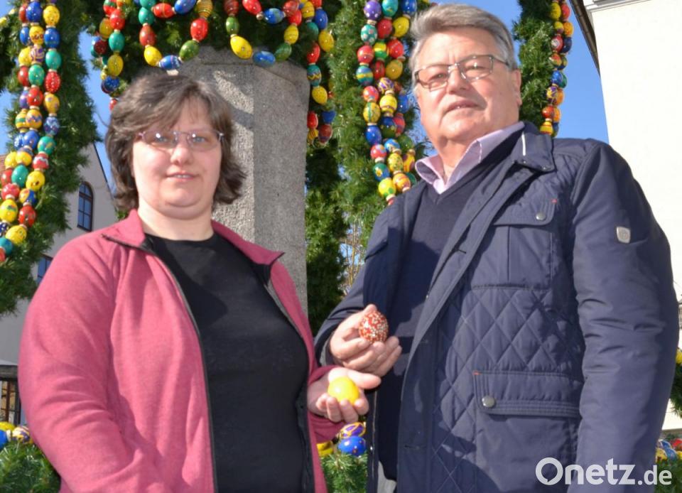 Gleich drei Menschen sind an der Verzierung der Ostereier für den Brunnen am Oberen Markt in Weiden beteiligt. Elfriede und Günther Magerl grundieren die Eier in zwei Schritten, Anita Uschald bemalt sie mit Pinseln verschiedener Stärken. Danach sorgt das Ehepaar Magerl mit Klarlack für Beständigkeit. Das funktioniert: Viele der Eier am Osterbrunnen halten schon seit sechs Jahren und gehören zum ersten Satz Eier, an dem auch die Schüler der Stötznerschule mit Förderlehrerin Luise Amschl einst kräftig mitgewirkt haben.