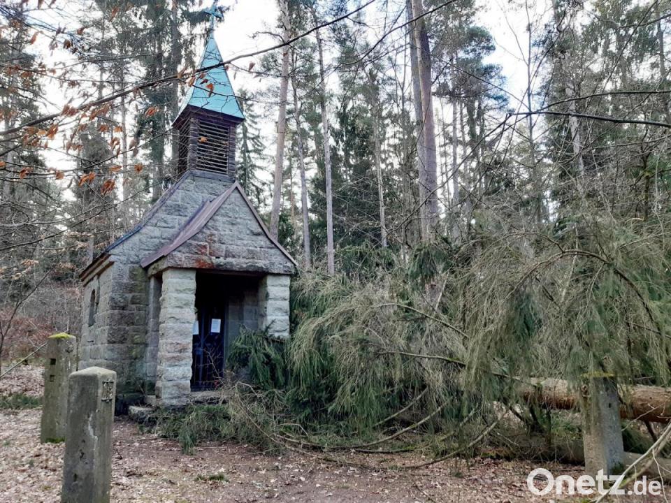Ein paar Zentimeter mehr und die dicke Fichte hätte das Dach durchschlagen und die kleine Kapelle zertrümmert. Sogar die steinernen Kreuzweg-Säulen blieben verschont. Nun liegt der Baum, als hätte ihn jemand arretiert, mit dem Wipfel zuerst vor der Tür der Kapelle "Heilige Staude" im Südosten von Weiden. Entwurzelt und umgeworfen haben ihn die beiden Stürme "Ylenia" und "Zeynep", die in den vergangenen Tagen durch die Nordoberpfalz rollten. Ein unbeschreibliches Glück empfindet Ursula Breinbauer, dass "einem Kleinod der Stadt nichts passiert ist". Ihre Familie kümmert sich seit Generationen um das uralte Bauwerk, in dem auch Christmetten stattfinden.