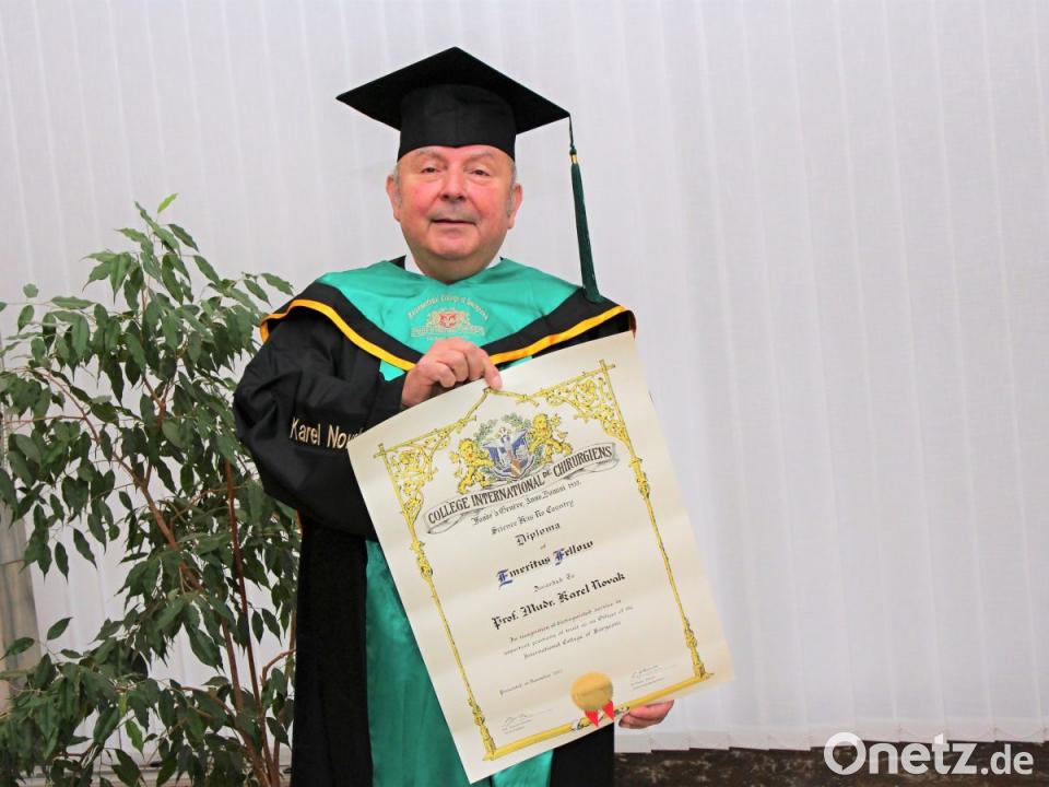 Zweiter im Bunde war Professor Dr. Karel Novak, FICS, ehemaliger Oberarzt der Chirurgischen Klinik in Weiden. Er engagiert sich auch nach der Pensionierung weiterhin für das Klinikum, indem er die internationalen Kontakte pflegt und sich um wissenschaftliche Aufgaben kümmert. Er erhielt eine Auszeichnung für seine Verdienste in Form einer Urkunde für seinen wissenschaftlichen Vortrag und für die jahrelange Tätigkeit sowie Mitgliedschaft in der ICS.