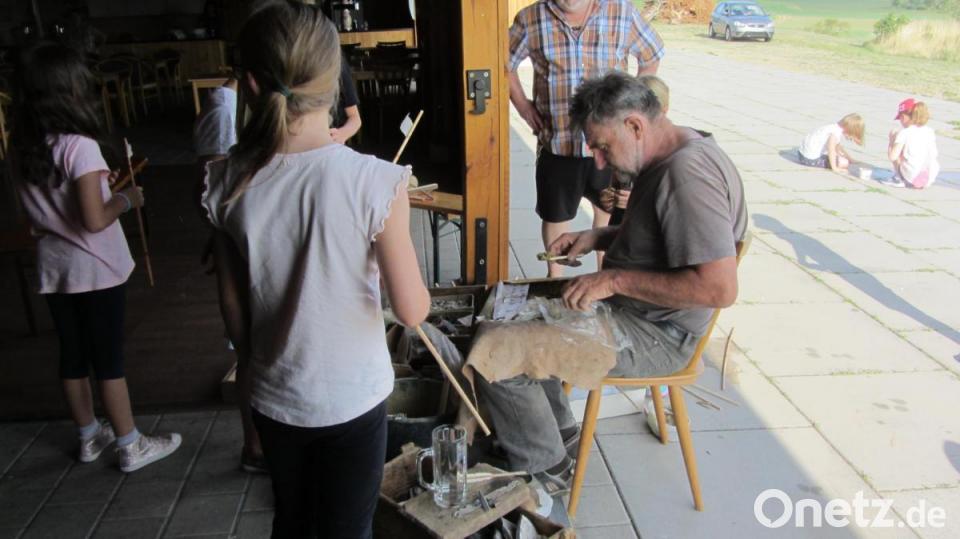 Der Grabungstechniker beim Landesamt für Denkmalpflege, Lothar Breinl, nahm die Kinder zwei Stunden lang mit auf eine kurzweilige Zeitreise in die Welt der Steinzeitmenschen, erzählte ihnen, wie die Menschen damals gelebt haben und zeigte ihnen verschiedene Handwerkstechniken der Vorzeit. "Experimentelle Archäologie" nannte es Breinl, wenn die Kinder unter seiner Anleitung beispielsweise ausprobieren durften, wie mit Hilfe von Feuersteinen Funken geschlagen, Pfeilspitzen hergestellt oder aus Muscheln Schmuckgegenstände gemacht werden.