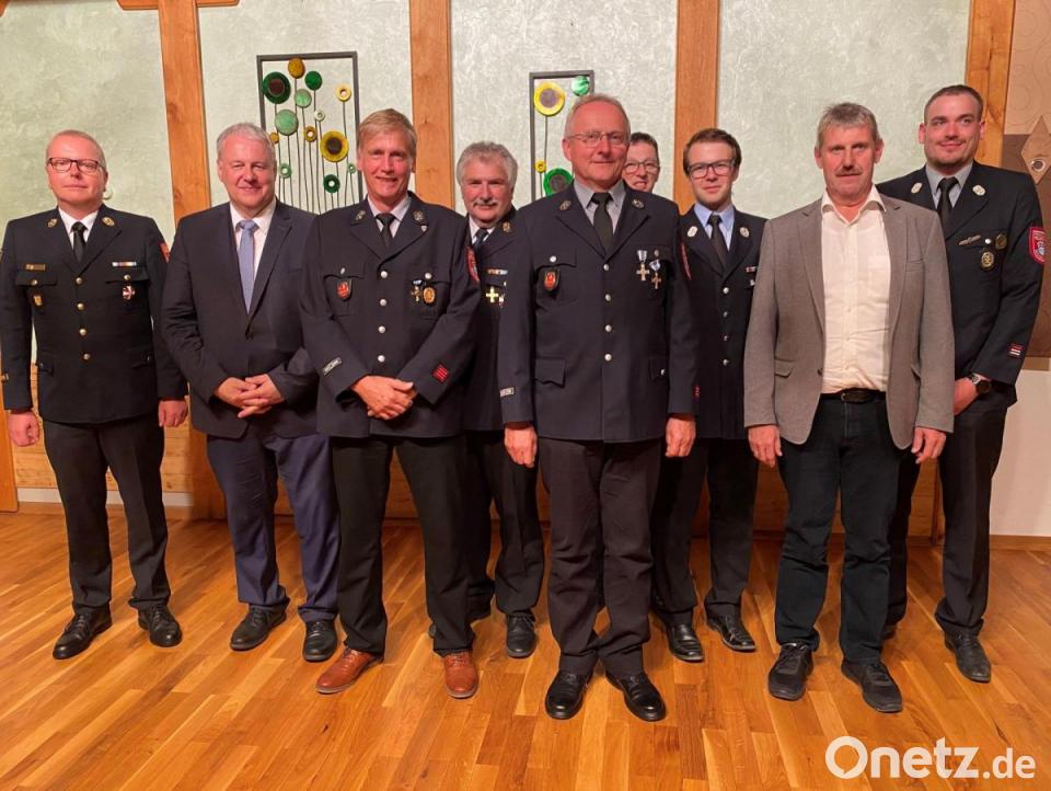 Oswald Pilhofer (vorne) und Robert Luber (Dritter von links) sind seit 40 Jahren bei der Feuerwehr Weigendorf aktiv. Dafür erhielten sie nun das Ehrenzeichen in Gold, zu dem Landrat Richard Reisinger (Zweiter von links), Bürgermeister Reiner Pickel (Zweiter von rechts) und die Feuerwehr-Führungskräfte gratulierten.