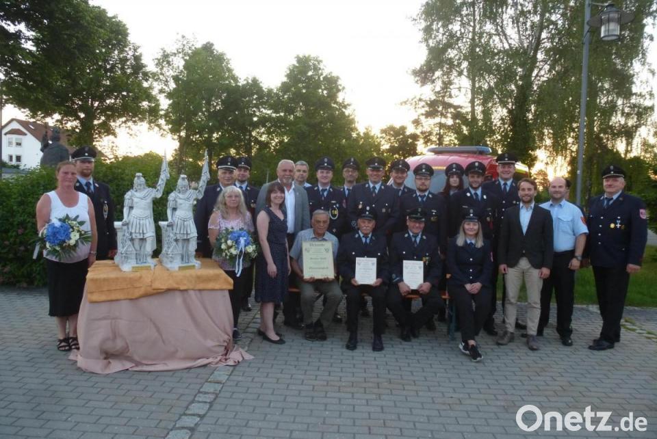 Von zwei unterschiedlichen Typen, die gerade deswegen in den letzten zwölf Jahren viele Aufgaben und Veränderungen gut gemeistert hätten, sprach Buchmann. „Ihr bleibt uns beide als Gruppenführer erhalten und mit euren Familien ein sehr wichtiges Glied in unserem Verein. Aber ohne das Verständnis und das Zutun eurer Frauen hättet ihr nie so erfolgreich sein können.“ Buchmann übergab, begleitet von stehenden Ovationen, Blumen und als Abschiedsgeschenk an die Kommandanten große Florians-Figuren aus Naturstein. Kreisbrandrat Marco Saller bat um Unterstützung der neuen Führung und dankte Rodler und Prün.