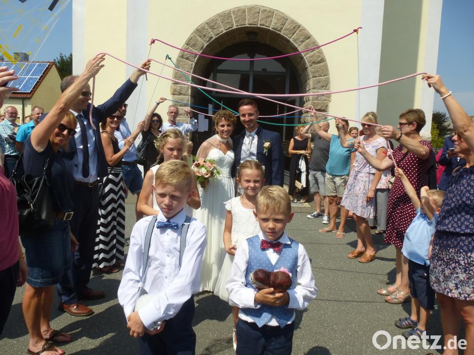 Marc Rothballer trug die Meditation "Zwei Kugelhälften" vor. Nach dem Auszug musste das Kollegium der Realschule Kemnath beim Ehrenspalier mit Mathe- und Sportutensilien trotz der Ferien in glühender Hitze nachschwitzen. Für den Kirwaverein gratulierte Vorsitzender Ralph Egeter mit einem großen Lebkuchenherz. Angeführt vom Brautpaar im offenen Käfer-Cabrio, startete der 90-köpfige Hochzeitskonvoi zum Restaurant Schwanhof, wo die "Pina Coladas" die ausgiebige Feier bereicherten.
