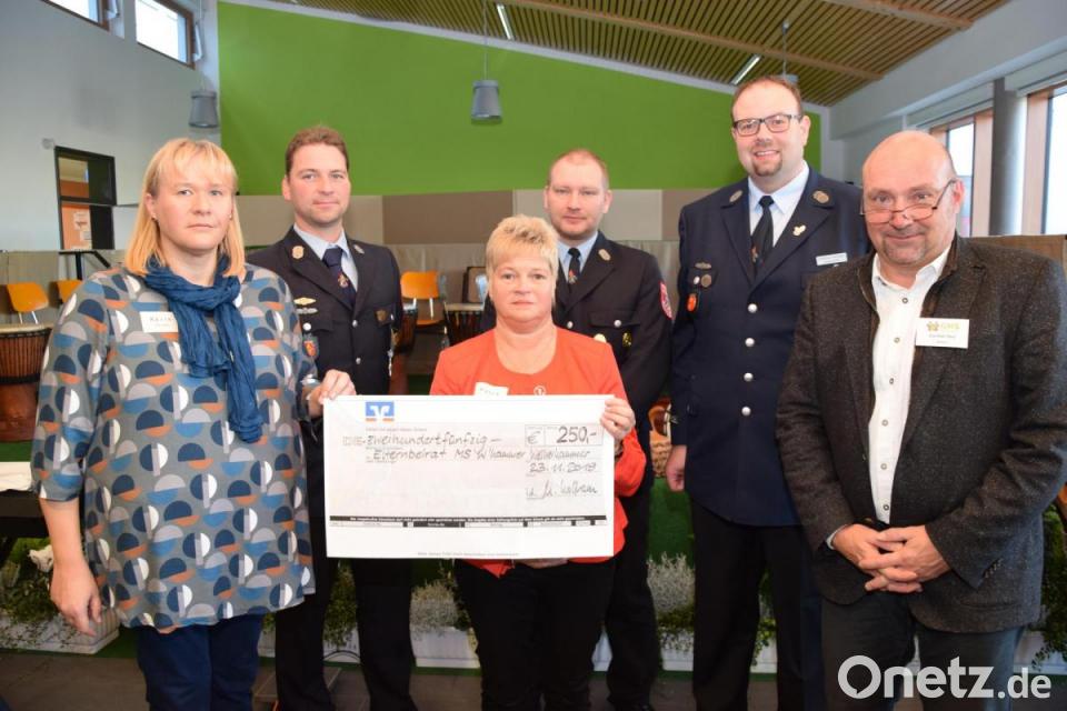 Ihr 145-jähriges Bestehen feierte die Wehr mit einem großen Fest. Da sei schon was übrig geblieben, betonten Matthias Wolfram, Andreas Biersack und Bernhard Prünn (hinten von rechts). Das Jubiläum der Schule war für die Feuerwehr der beste Rahmen, die Spende an den Elternbeirat zu überreichen.