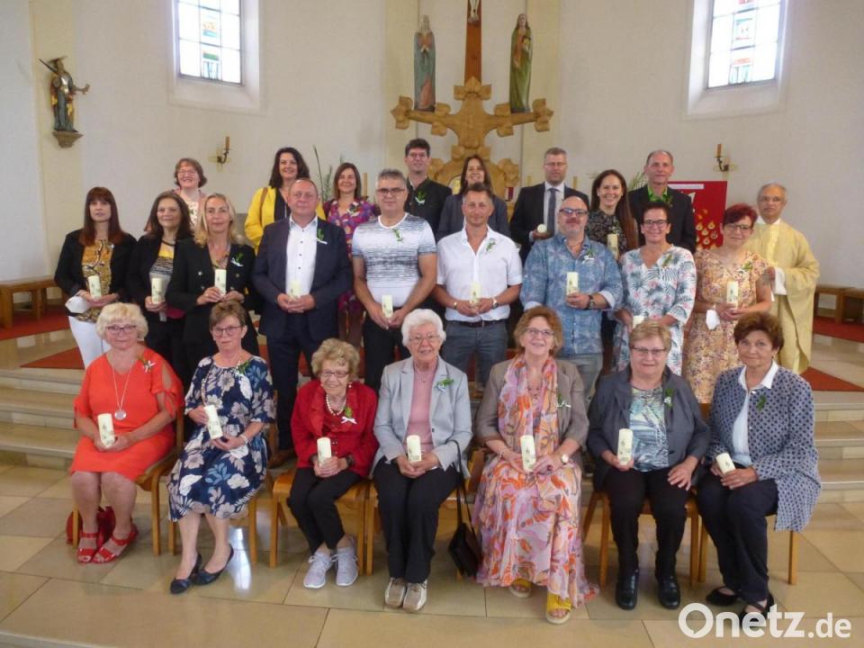 Pfarrgemeinderatssprecher Wolfgang Krauß begrüßte 26 Männern und Frauen zur Jubelkommunion am Sonntag in der Pfarrkirche Weiherhammer. Claudia Pirker, geborene Schuster, war dazu bis aus Pingsheim bei Köln angereist. Carola Magerl, Irene Eckert, Inge Kellermann, Marga Oppitz und Adelheid Geillersdörfer feierten die 60.Wiederkehr ihres Festtags. 10 Teilnehmer begingen das 41., 9 das 40. Jubiläum. Neben dem Gemeindegesang bestachen Gotthard Betz (Tenor) und Ulrike Rauch (Mezzosopran) bei Liedern von Kathi Stimmer-Salzeder. Am Schluss des Gottesdienstes erklang das „Segne du Maria“. An der Orgel begleitete Michael Bertelshofer. Pfarrer Varghese Puthenchira zelebrierte den Gottesdienst.