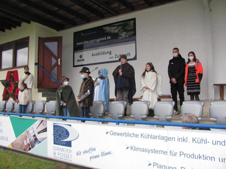Coronabedingt fand auch dieses Jahr die Krippenfeier für die Kinder wieder auf dem Fußballplatz statt. Lisa und Josef Ziegler bedauerten die fehlende Romantik, doch dies sei auch eine Gelegenheit, den wahren Sinn von Weihnachten besser zu verstehen, denn Jesu Geburt sei ebenfalls frei von Romantik gewesen. Luca Rittner erzählte, wie Josef und Maria vergeblich nach einer Herberge suchten. Luca Melischko als Josef war verzweifelt, doch Mia Melischko als Maria hatte Vertrauen zu Gott.