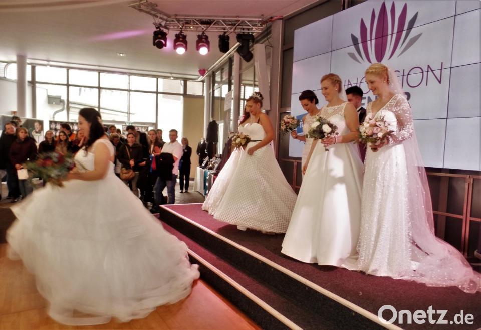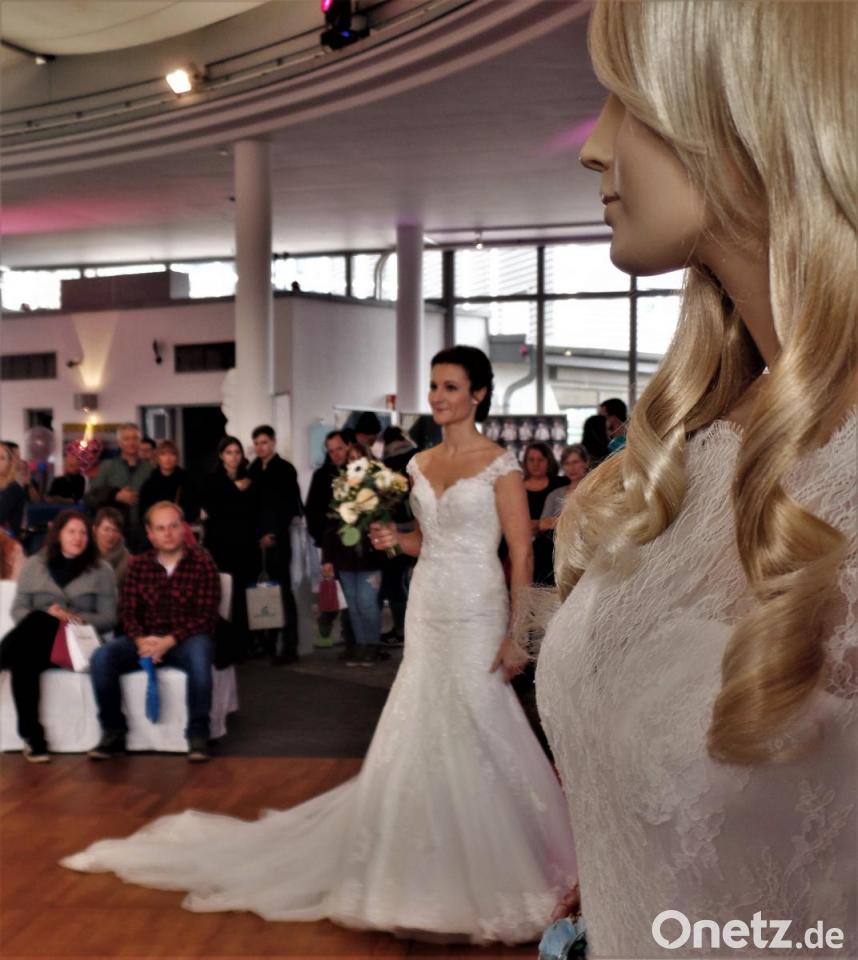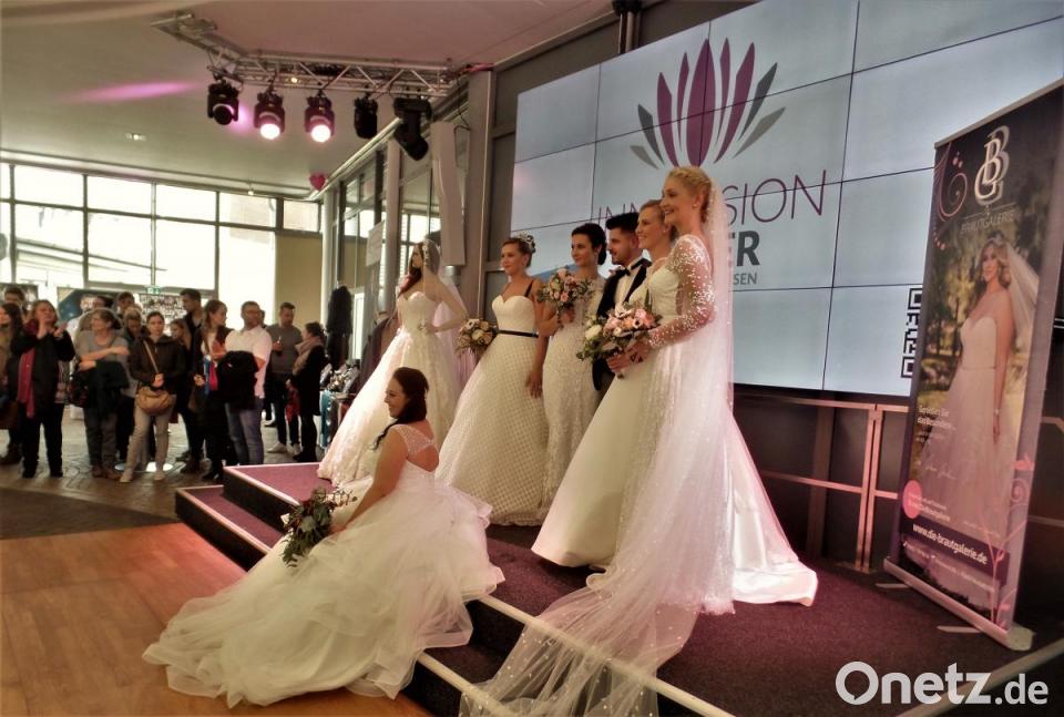 Beim Rundgang durch die Halle staunten die Besucher aller Altersgruppen über das umfassende Angebot rund um so ein Fest. Größtes Interesse fand natürlich die Brautmodenschau. Etwa 150 Besucher warteten auf die Kreationen aus der Brautgalerie Neustadt. Dann schwebte deutlich mehr als ein Hauch von Pariser Haute Couture bei den Vorführungen der fünf Models durch die Ausstellungshalle. Vorherrschende Farbe der Roben: Weiß. Kleider mit schlanken Linien und geradem Schnitt trugen die Damen ebenso graziös wie aufwendige Tüllkreationen mit mehrere Meter langen Schleiern. Fantasievoll gesteckte Brautsträuße von Floristik Wildbrett ergänzten das festliche Ambiente. Der Weidener Herrenausstatter Turban kleidete das männliche Model vom Kopf bis zu den Schuhen formvollendet in dunkle Anzüge und Smokings aus edlem Tuch.