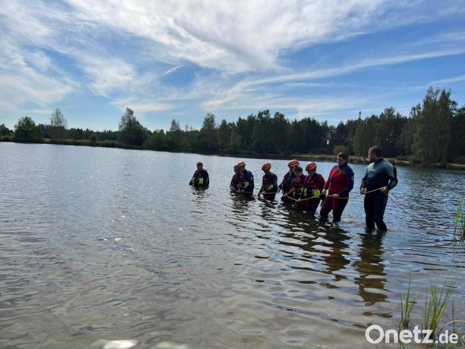 Um 10 Uhr hieß es "Wassernot". Am Baggerweiher wartete bereits die Wasserwacht, um die Jugendlichen einzukleiden. Eine Person galt als vermisst und war durch eine Wasserrettungskette zu suchen. Auch in einem völlig fremden Element fanden sich die Nachwuchskräfte schnell zurecht und konnten die Person finden und bergen. Nach dem Mittagessen dann der letzte Einsatz unter dem Stichwort „Grubenrettung“. Eine Person war in einen Schacht gefallen und war aus hilfloser Lage zu befreien.