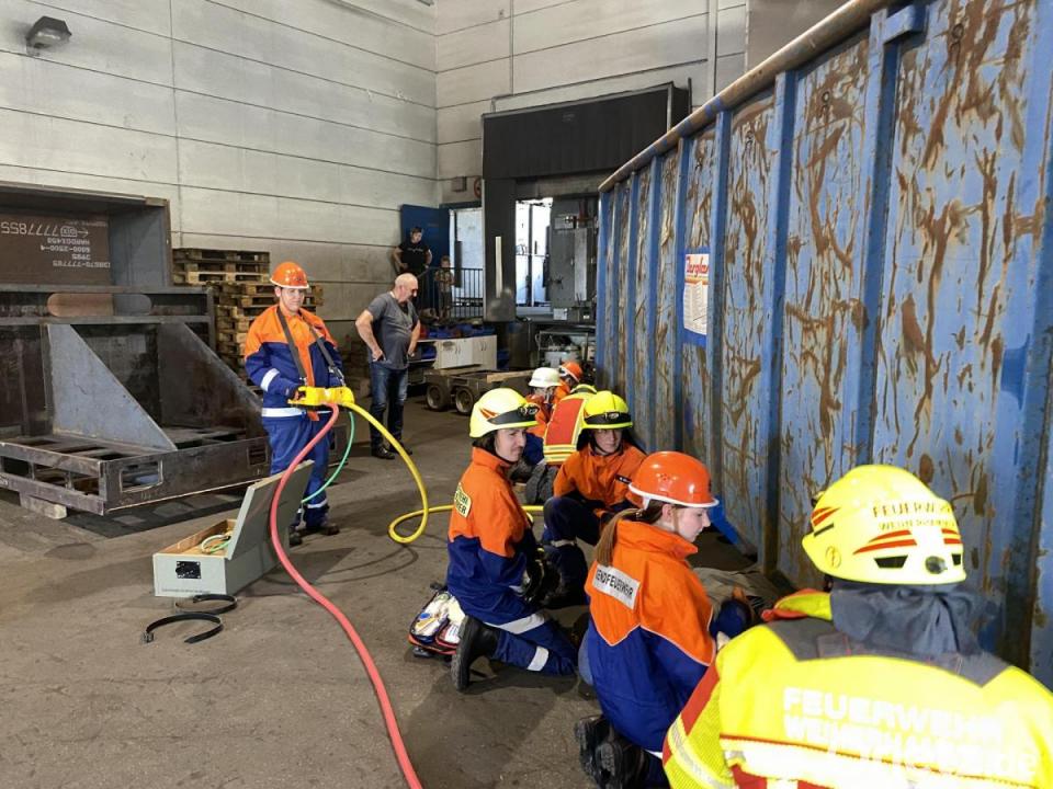 Um 17.30 Uhr schallte der Gong durch das Gerätehaus und alarmierte zu einer eingeklemmten Person unter einem Container. Die Firma Bergmann, auf deren Gelände dieses Szenario dargestellt wurde, hatte für reelle Einsatzbedingungen gesorgt. Mittels Hebekissen gelang die Personenbefreiung. Vorsitzender Rajmund Buchmann erklärte danach noch weitere Methoden zur Befreiung.